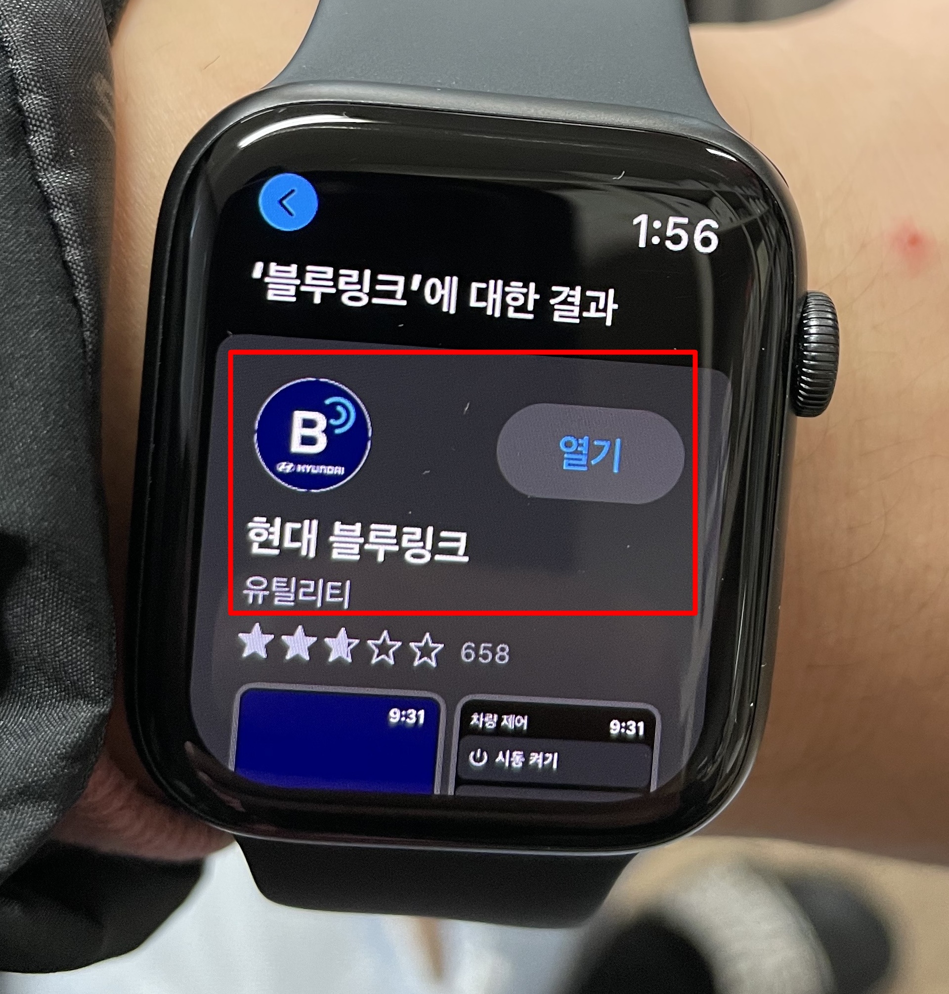 그럼 이렇게 현대 블루링크가 나옵니다. 저는 이미 설치되어 있기 때문에 열기라고 뜨지만 설치가 되어 있지 않다면 다운로드해주시면 되겠습니다. 그럼 애플 워치 화면에서 블루링크를 확인할 수 있습니다.