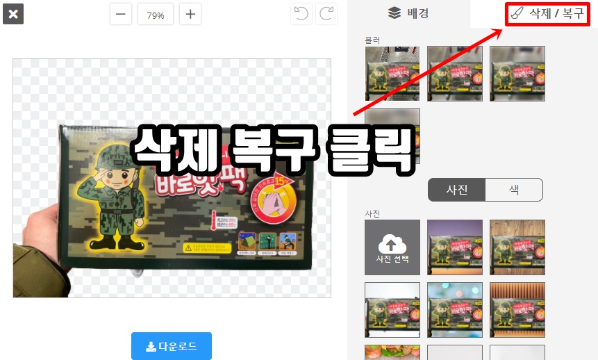 그리고 손모양을 지우기 위해서는 삭제/복구 메뉴를 이용해해 주시면 됩니다. 삭제 버튼을 누르시고 브러시 사이즈 조절하고 이미지 크리 조절을 하셔서 편하게 지워보시면 됩니다.