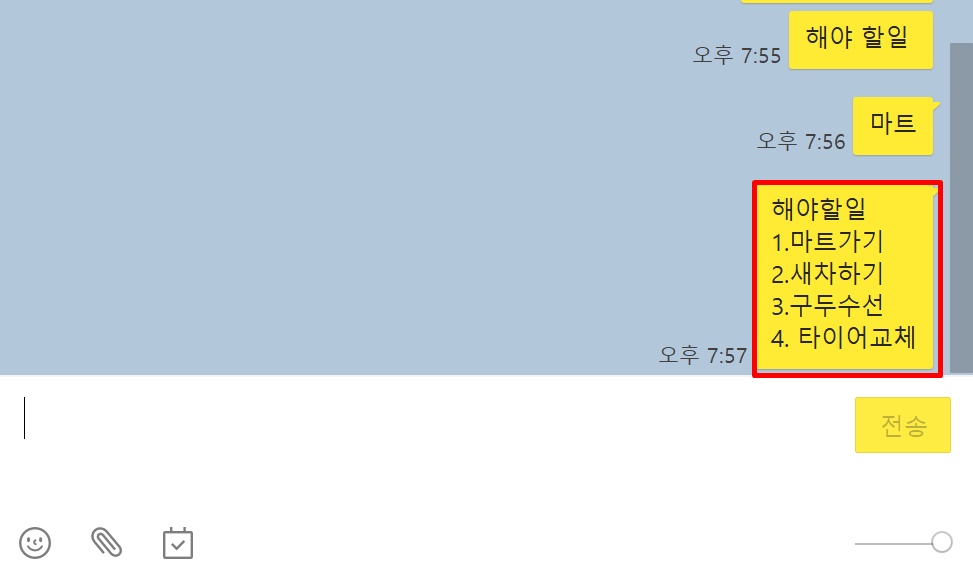 보통 문서 작업을 하다 보면 글을 쓰고 엔터키를 누르면 줄이 바뀌어 다음 줄로 넘어가기 마련입니다. 하지만 카카오톡에서는 엔터를 누르니 바로 전송이 되어서 그냥 한 줄로 쭉 이어서 글을 쓰곤 하였습니다.