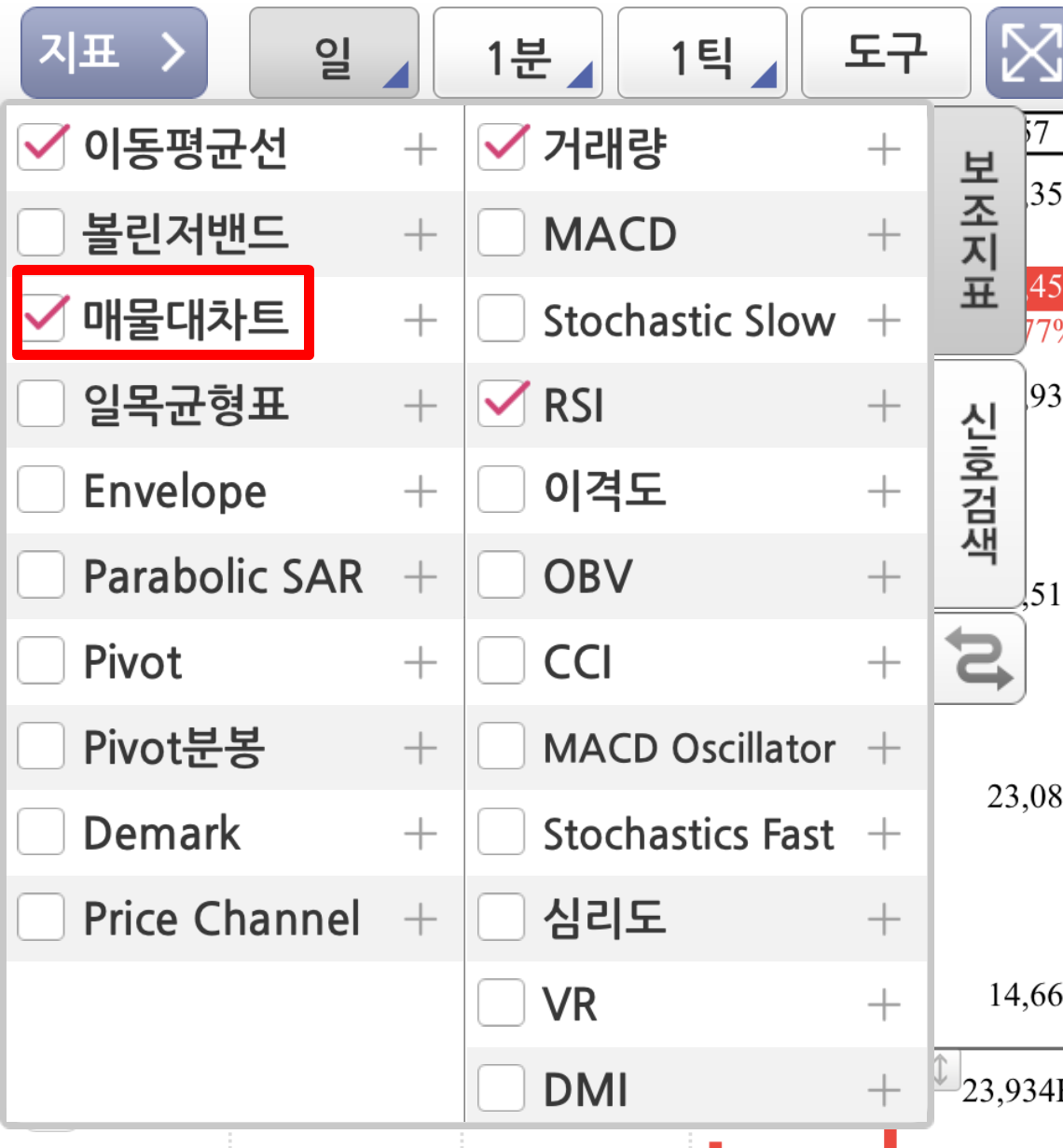 매물대 차트 설정의 차트 우측 상단을 보시면 지표라는 메뉴가 있습니다. 위 이미지 빨간색 네모를 보시면 되겠습니다. 지표를 클릭하면 차트를 보는데 도움을 줄 수 있는 메뉴들들이 나오게 됩니다.