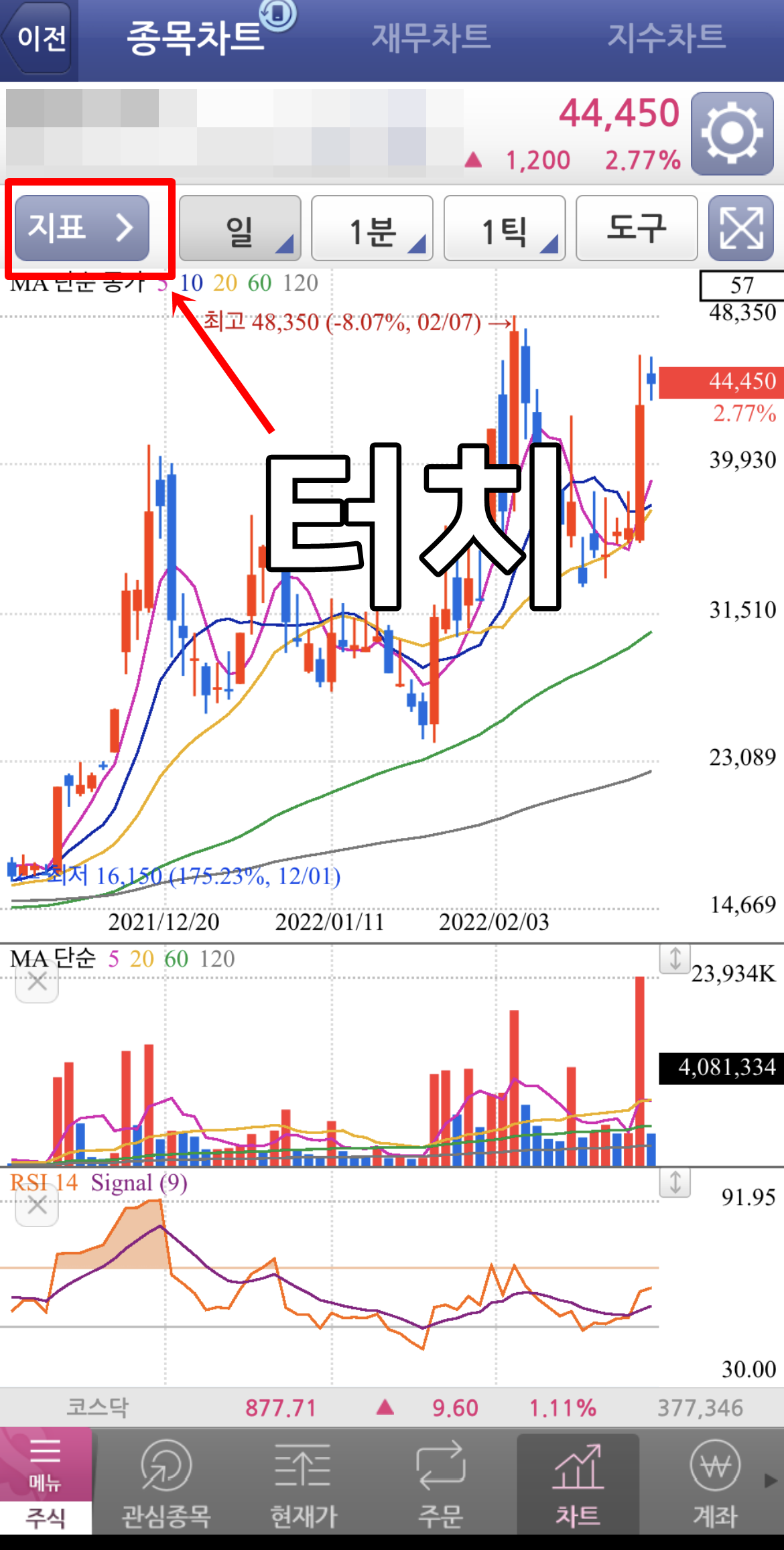 그럼 위 이미지와 같이 아래쪽에 관심종목, 현재가, 주문, 차트, 계좌등 메뉴를 보실 수 있습니다. 여기서 차트를 터치해주시면 그 종목에 대한 차트를 확인하실 수가 있습니다.