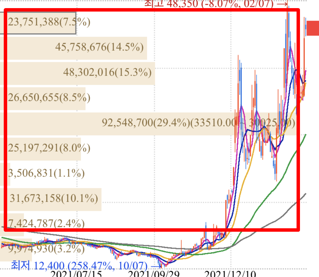 차트를 늘리고 줄이고 하면 매물대차트도 그에 따라 변경이 됩니다. 매물대차트를 볼때에는 기간도 중요하다고 생각이 듭니다. 어느정도 기간을 두고 매물대차트를 보고, 매수 매도 타이밍을 잡아 보시기 바라겠습니다. 다만 참고만 하시고 매수 매도는 신중하게 해 주시는 게 좋습니다.