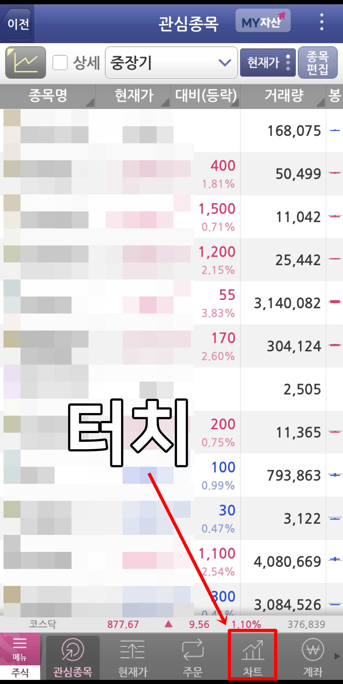 그럼 위 이미지와 같이 아래쪽에 관심종목, 현재가, 주문, 차트, 계좌등 메뉴를 보실 수 있습니다. 여기서 차트를 터치해주시면 그 종목에 대한 차트를 확인하실 수가 있습니다.