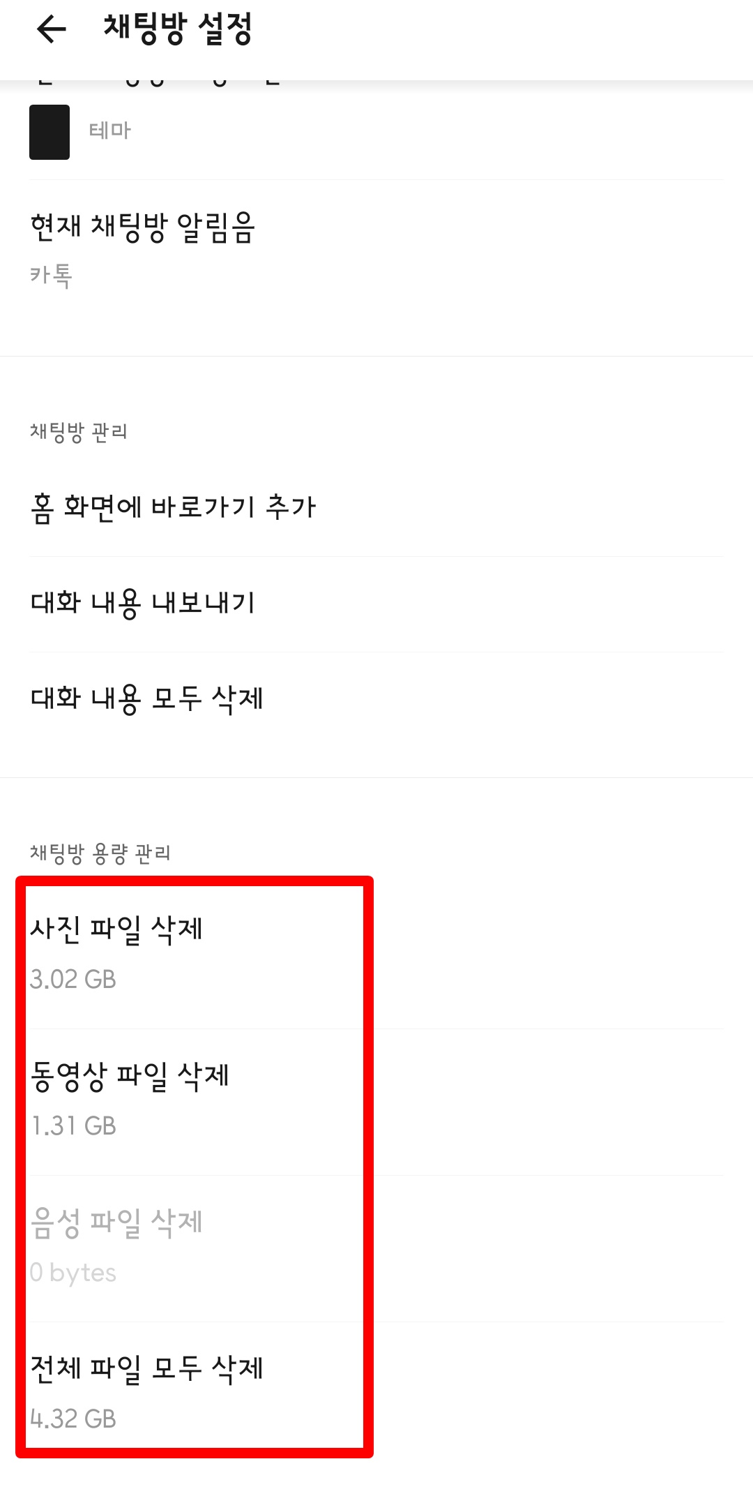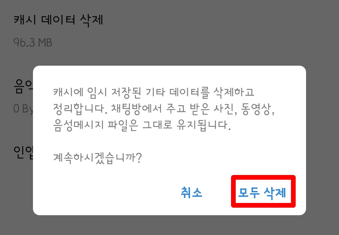 모두 삭제 눌러 주시면 끝납니다. 사실 요기서 보면 많은 용량이 지워지지 않는 듯합니다. 그래서 채팅방에서 직접 용량을 줄여 주시면 됩니다. 카카오톡을 하다 보면 자주 채팅하시는 분들이 있을 겁니다. 그분들과는 사진과 동영상도 많이 주고받았을 겁니다. 그 용량을 줄여 주시면 되겠습니다.
