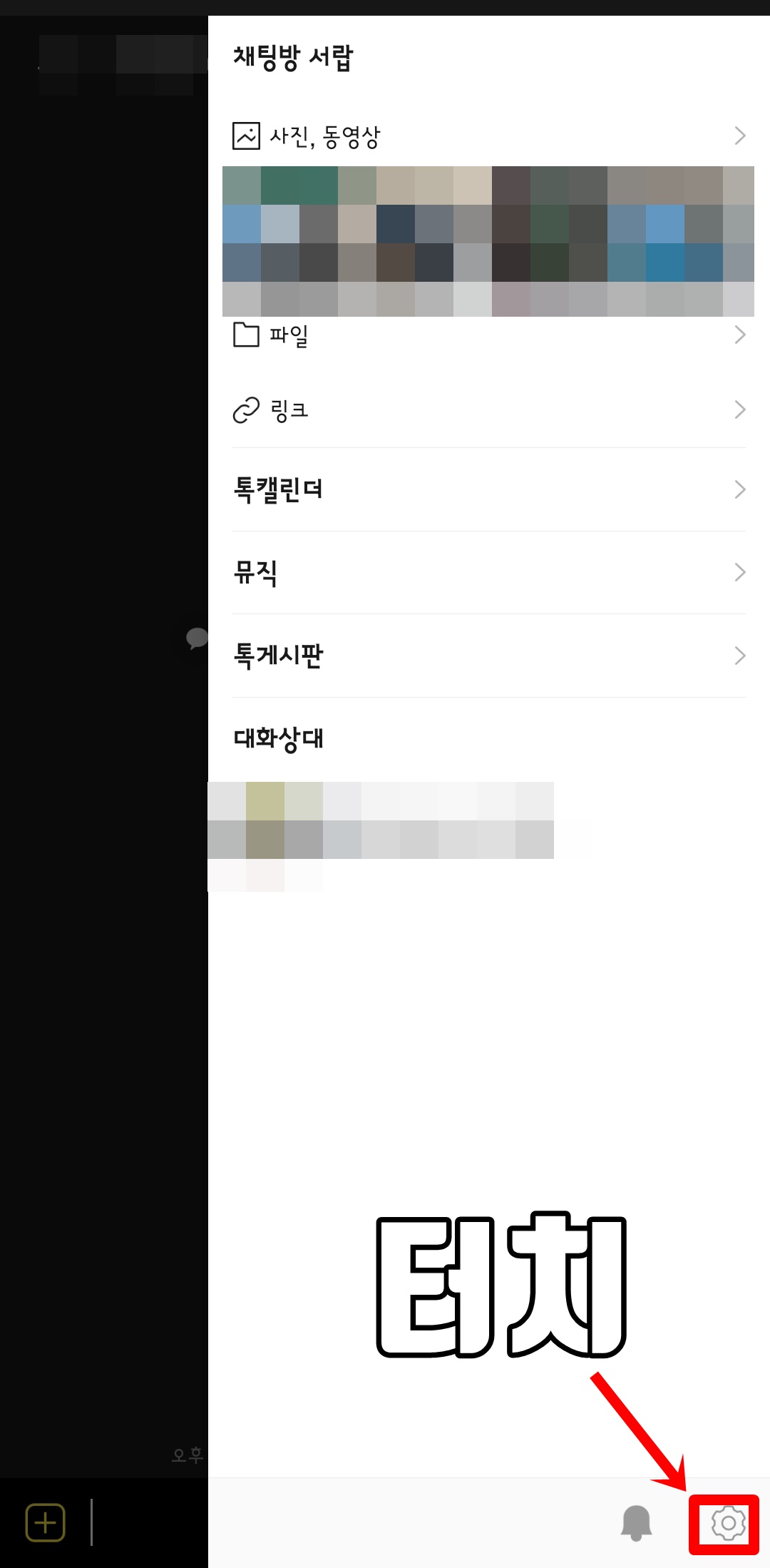 채팅창으로 들어 가주시면 됩니다. 여기서 우측 상단 줄 세 개를 눌러 주시면 채팅방 정보가 나오게 되고 좌측 하단을 보시게 되면 톱니바퀴 모양이 있습니다. 톱니바퀴를 눌러 들어가 주시면 되겠습니다.