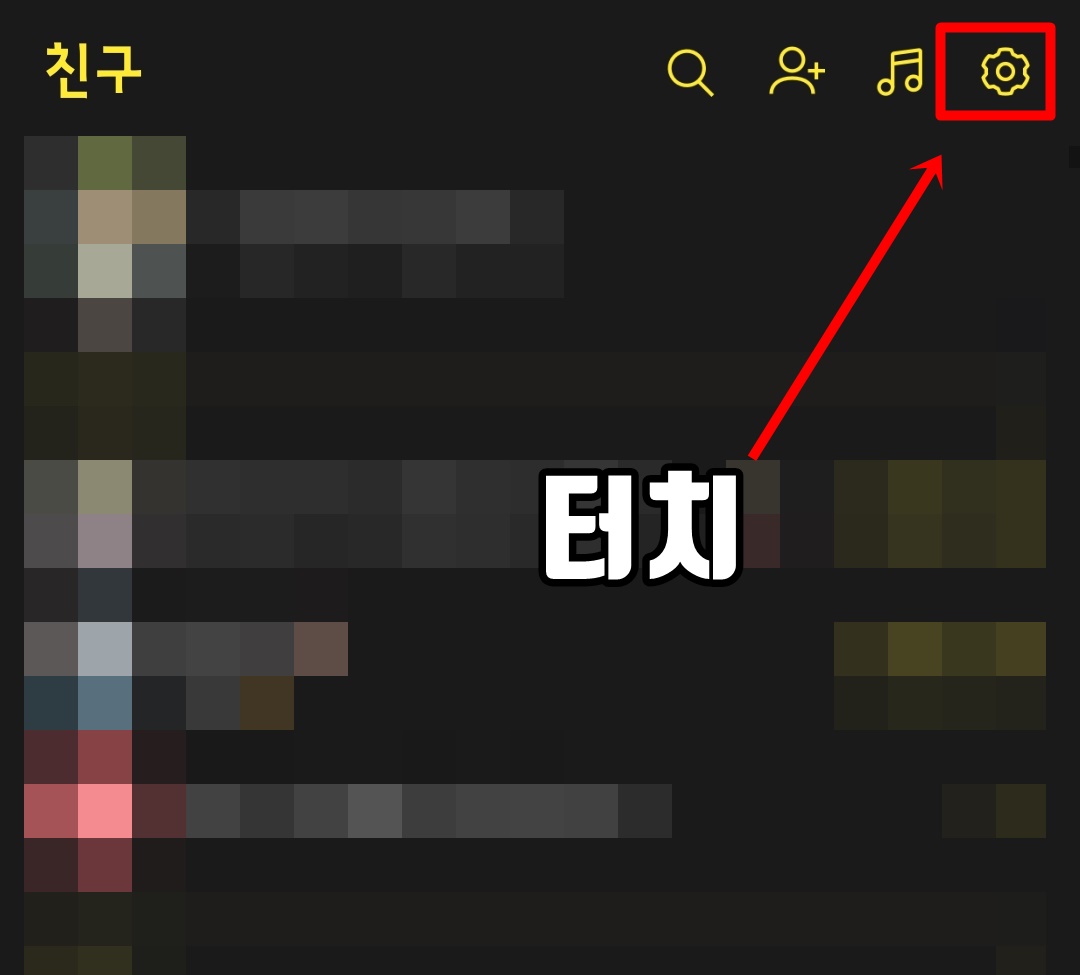 먼저 카카오톡을 실행시켜 줍니다. 메인화면에서 우측 상단 톱니바퀴 설정을 터치해주시면 편집, 친구 관리, 전체 설정 메뉴가 나오게 됩니다. 여기서 전체 설정을 터치하여 들어가 주시면 됩니다.