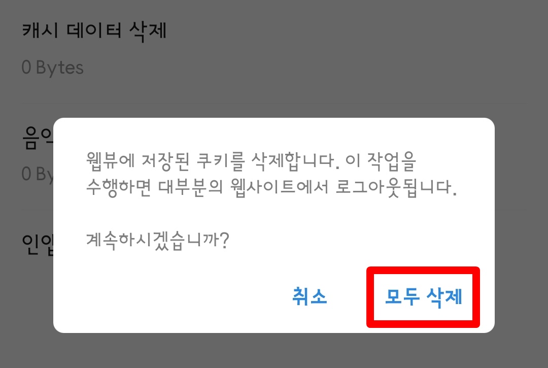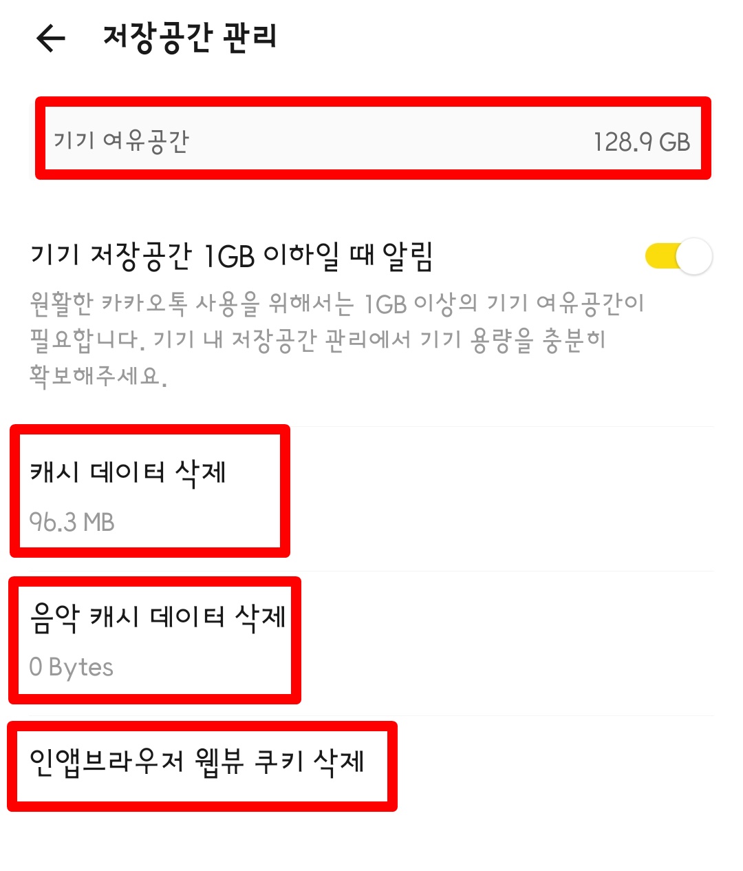 그럼 본인의 기기 여유공간이 나오고 아래쪽에 보면 캐시 데이터 삭제, 음악 캐시 데이터 삭제, 인앱브라우저 웹 뷰 쿠키 삭제가 있습니다. 하나씩 터치하여 삭제해주시면 되겠습니다.