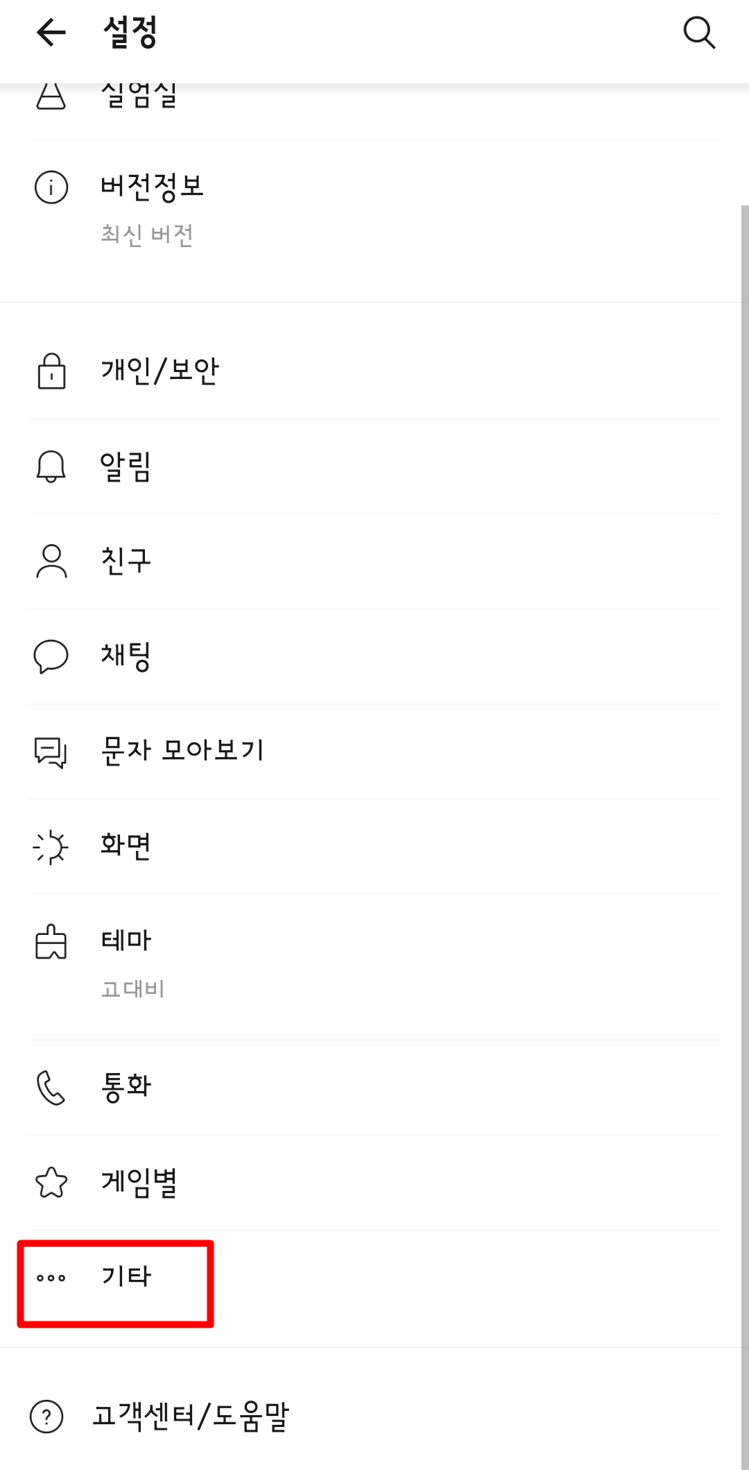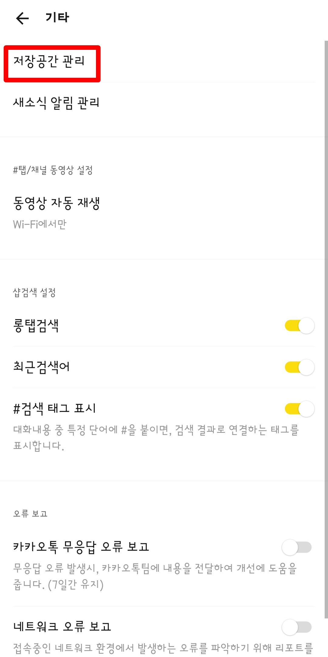그럼 여러 가지 메뉴들이 나오게 되는데 여기서 밑으로 조금 내려 주시면 기타가 있습니다. 기타 터치해주시면 되겠습니다. 그럼 제일 위에 저장공간 관리 메뉴가 있습니다. 저장공간 관리 터치하여 들어가 주시면 됩니다.
