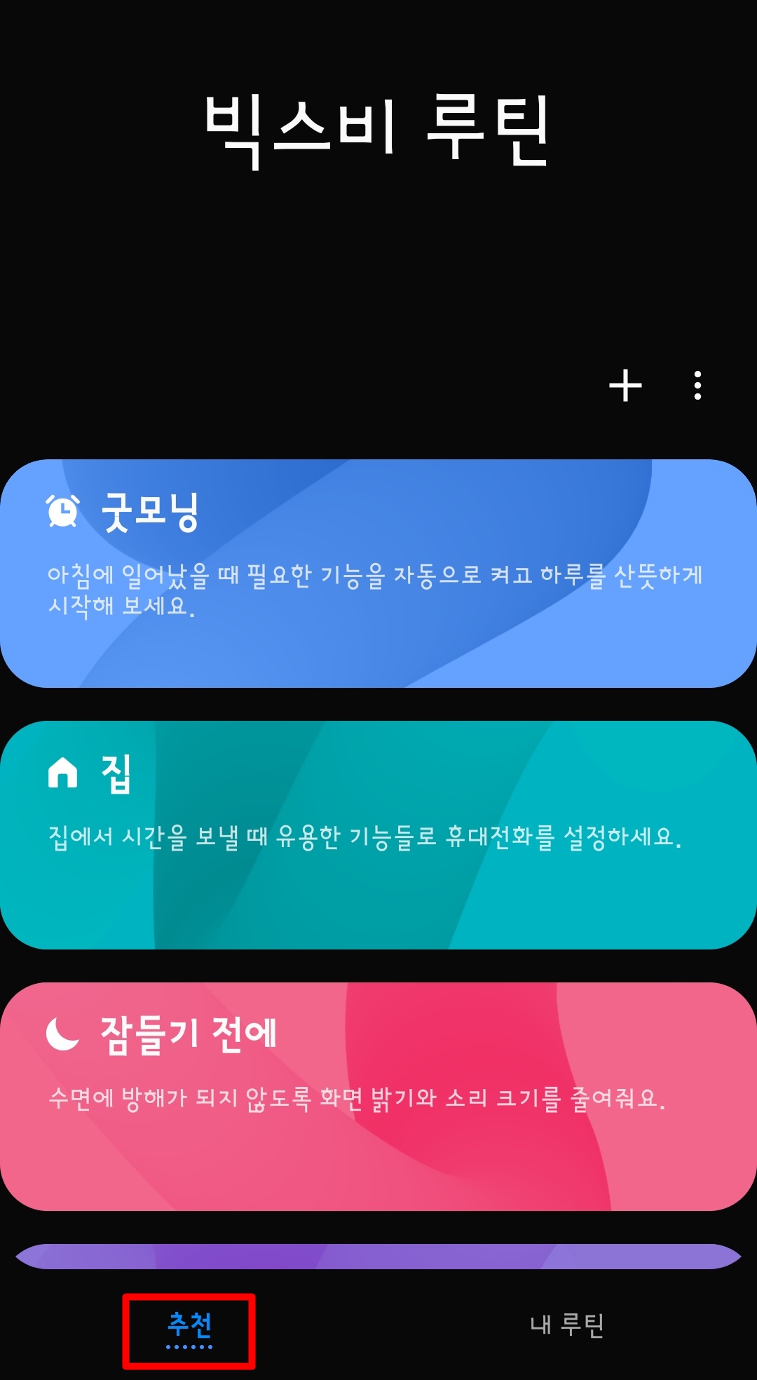 위 왼쪽화면이 빅스비 버튼 메인화면입니다. 추천 메뉴를 보실 수 있습니다. 굿모닝, 집, 잠들기 전에 등 다양한 추천 메뉴들이 있습니다. 본인이 보시고 필요한 부분 설정하시면 될 듯합니다. 그리고 오른쪽 사진은 내 루틴입니다. 제가 지금 사용하고 있는 루틴은 세 가지입니다. 제일 많은 가는 장소 세 곳을 설정해놓았습니다.