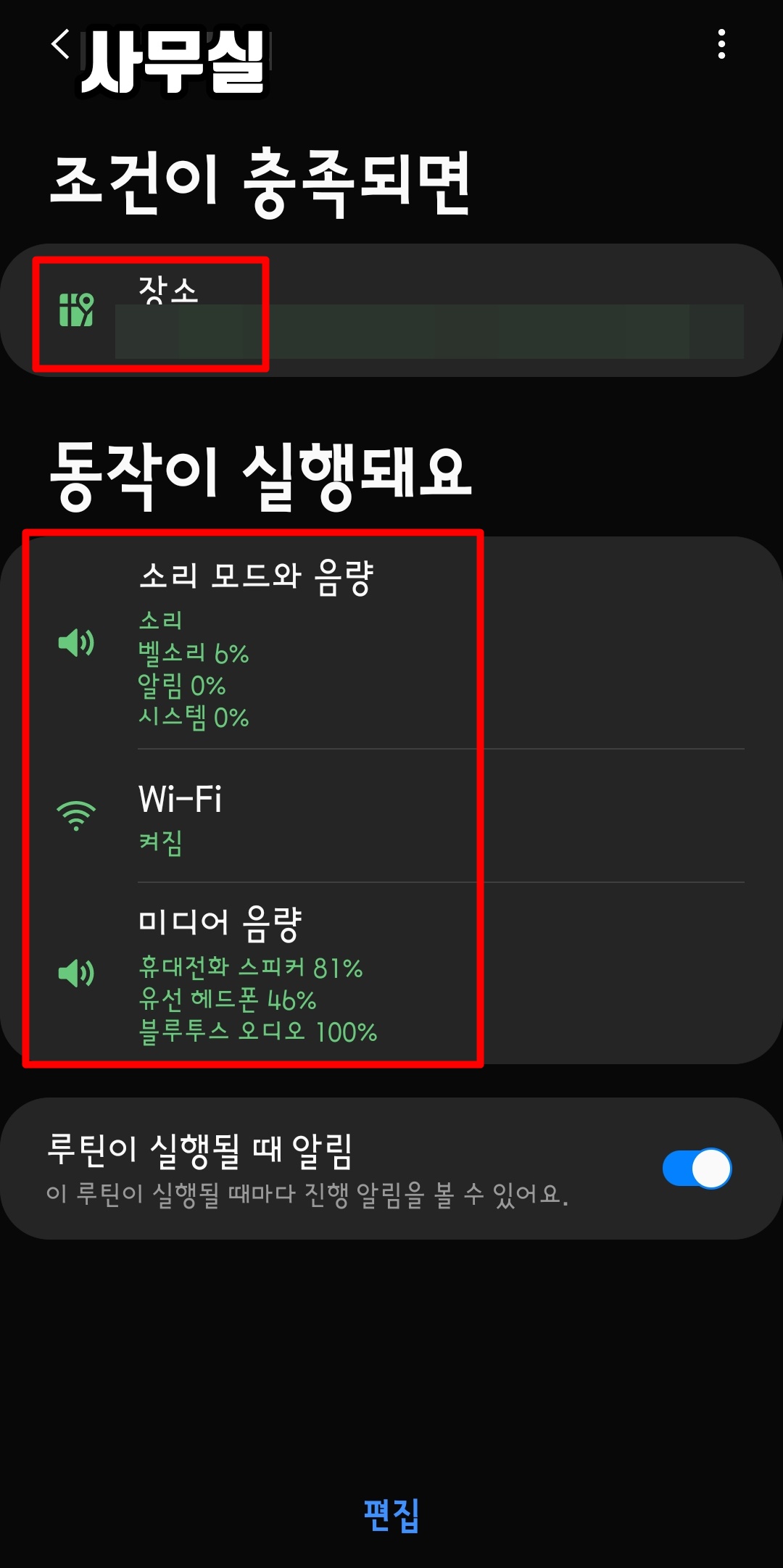 먼저 매일마다 타고 다니는 자동차입니다. 차에 타고 자동차와 블루투스가 연결되면 설정해놓대로 설정이 됩니다. 그리고 집, 사무실은 내가 설정해놓은 주소로 가면 설정이 됩니다. 정말 편리한 기능 아닌가요? 꼭 사용해보시기 바라겠습니다.