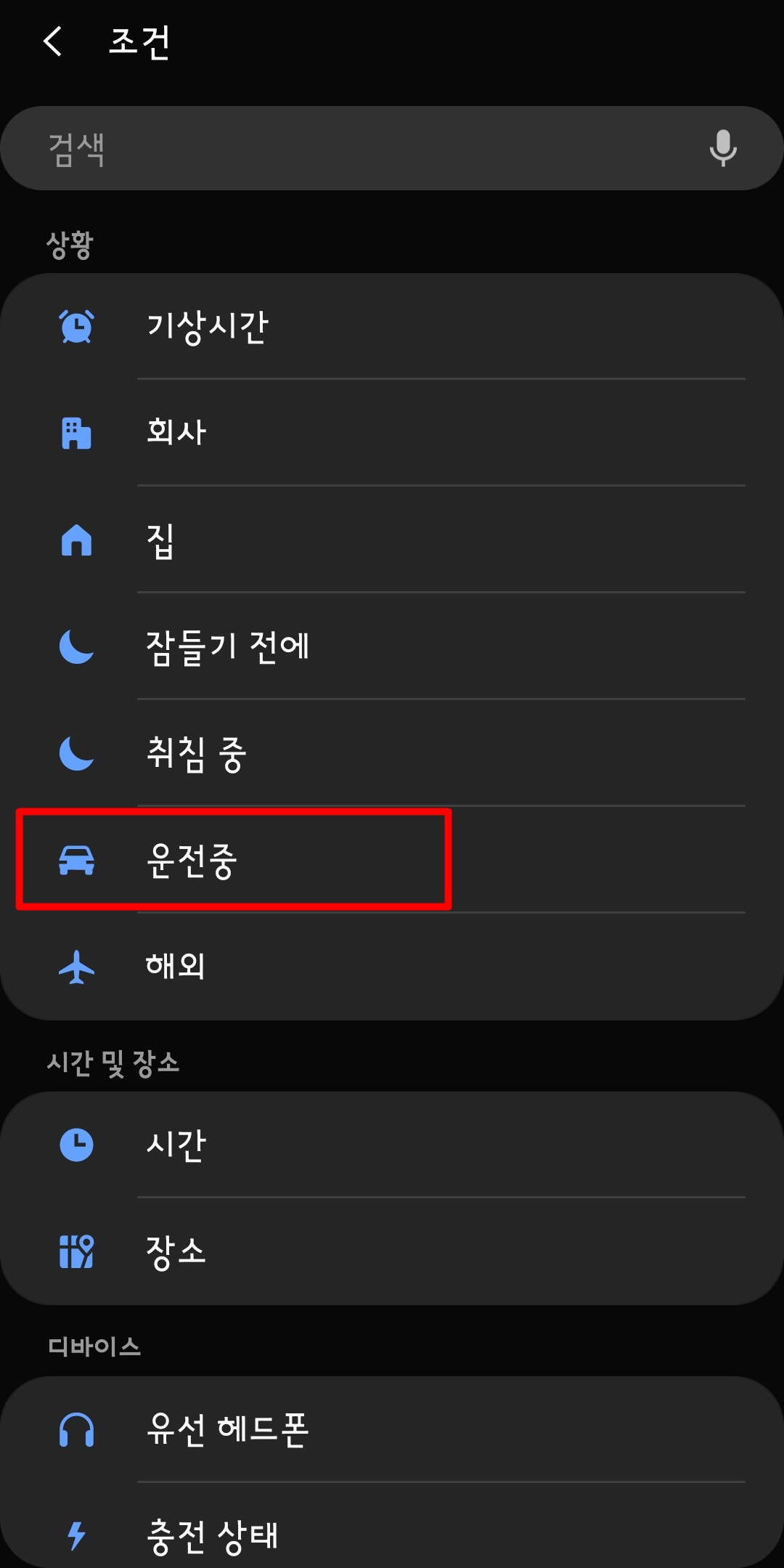 운전 중을 선택하면 본인 자동차의 블루투스가 연결되면 설정되도록 해주시면 되겠습니다.
