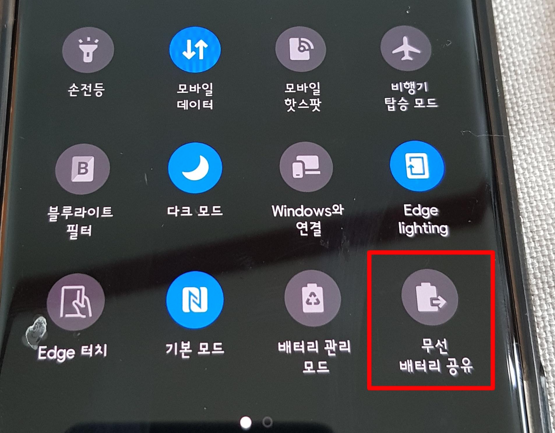 먼저 배터리를 공유받을 휴대폰에 빠른 메뉴 화면으로 가주시면 됩니다. 그럼 무선 배터리 공유가 있습니다. 무선 배터리 공유를 터치해주시면 되겠습니다.