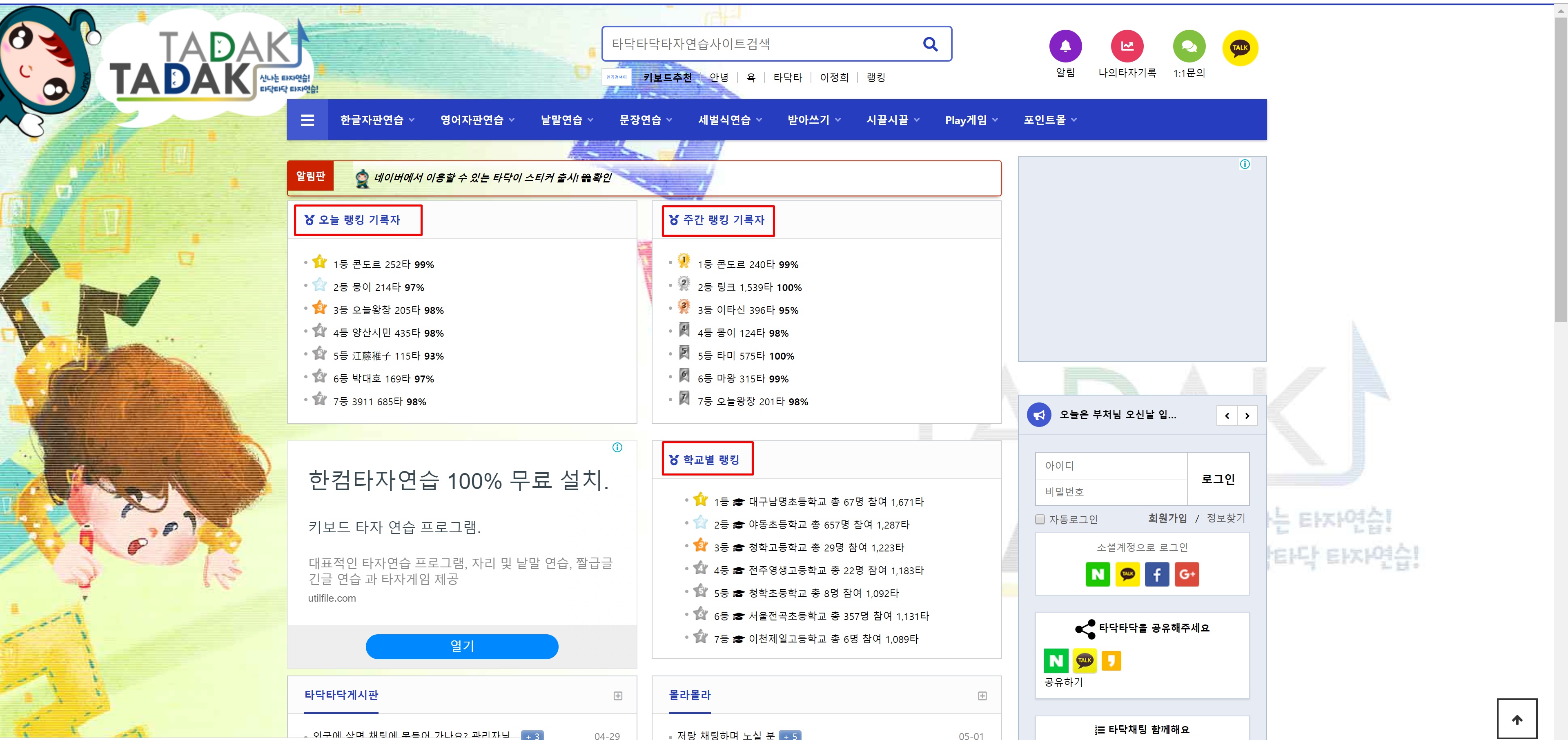 메인 화면 모습입니다. 메인화면에 보면 또 승부욕을 자극하는 랭킹이 있습니다. 오늘 랭킹, 주간 랭킹, 학교별 랭킹이 있습니다. 괜히 저런 거 보면 한번 도전해보고 싶습니다. 하지만 로그인을 해야지만 가능합니다. 타자 연습은 로그인 없이도 가능합니다. 필요하신 분만 로그인해주시면 되겠습니다.