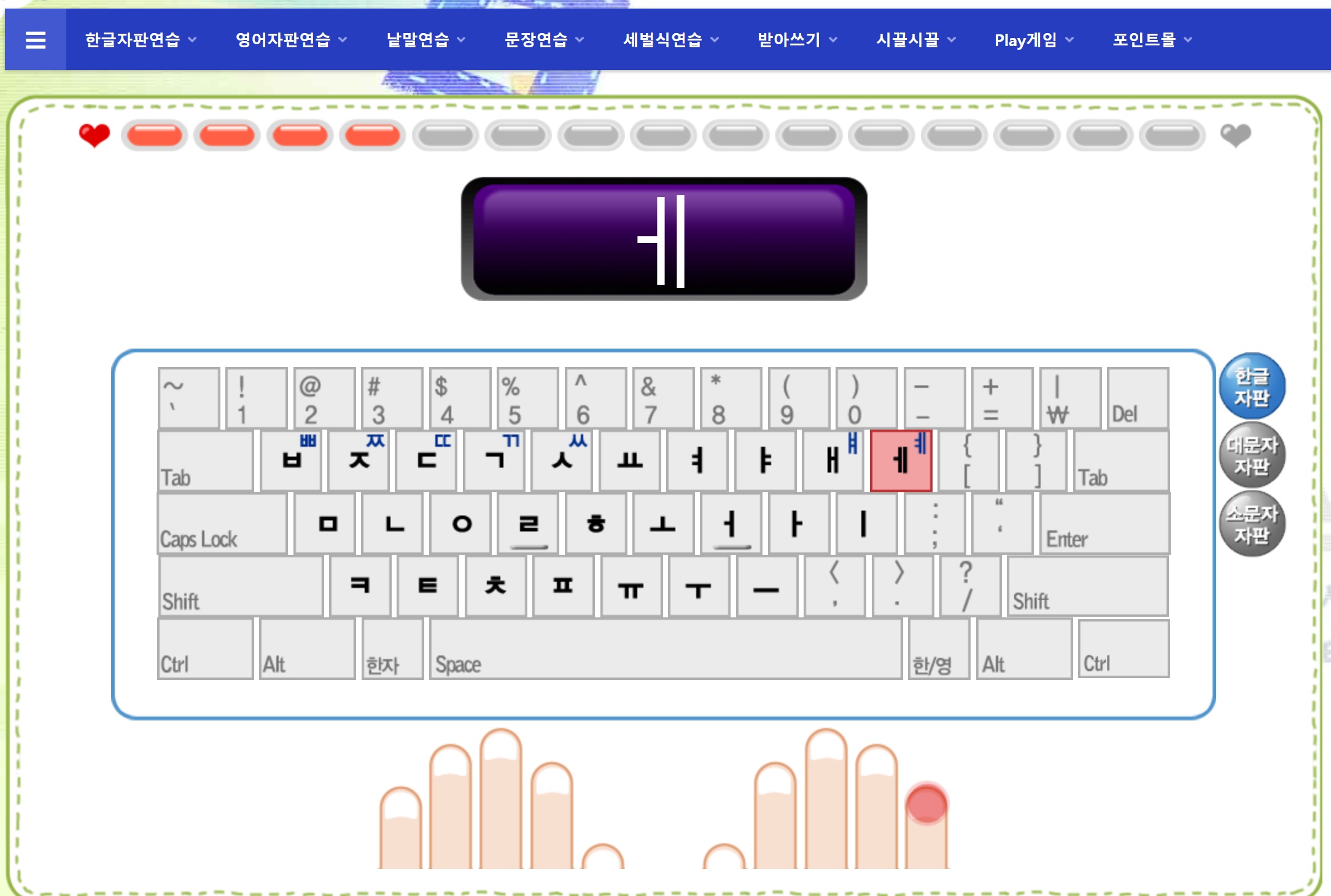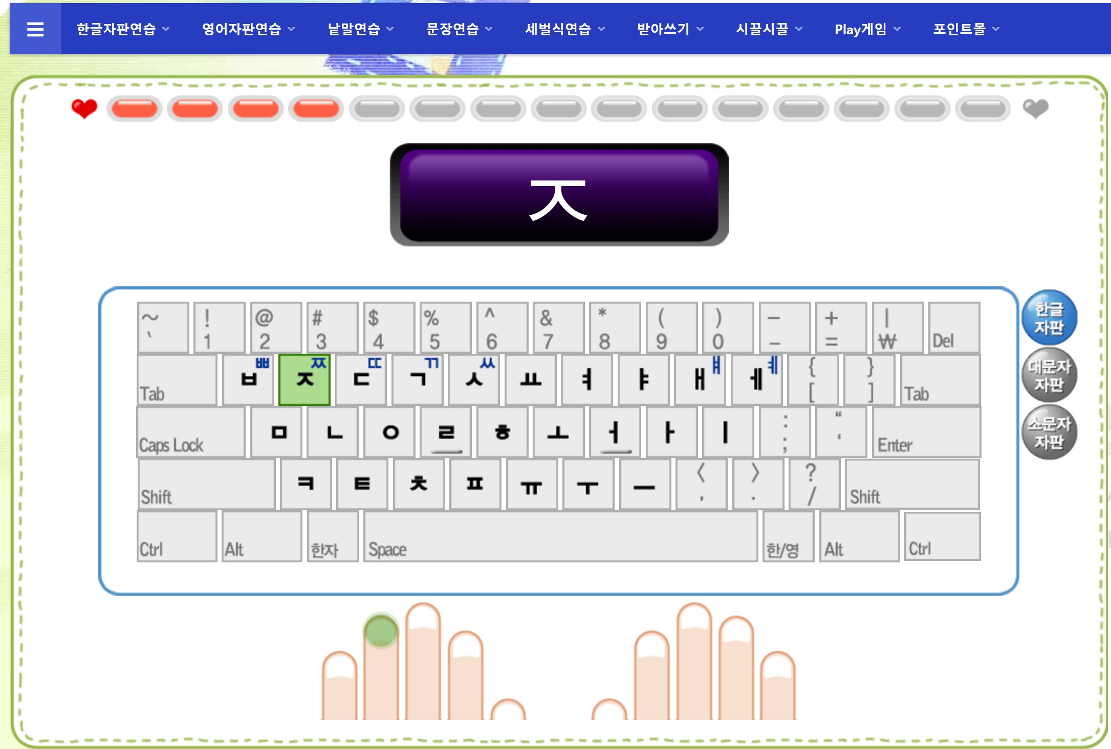 뿐만 아니라 영어자판도 쉽게 연습할 수 있도록 되어 있어 편하게 연습이 가능합니다. 저도 몇 개는 외웠지만 직접 단어를 쳐보려고 하니 생각보다 어렵더라고요. 엄청 숙달이 되어야 그나마 영어 타자를 잘 칠 수 있을 듯합니다.