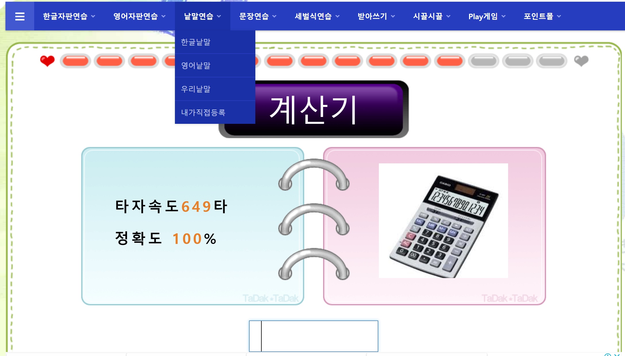 저도 요즘 영어 타자 연습을 하고 있습니다. 한글 타자는 문제가 없는데 영어 타자는 아직도 많이 힘듭니다. 그래서 조금씩 타탁타탁타자연습을 이용하여 연습을 하고 있습니다. 오랜만에 타자 연습하니까 재미는 있더라고요. 예전에도 타자연습 한번 해보고 싶어서 찾아보았는데 다운로드를 해야해서 안 했는데 타닥타닥 타자연습은 설치 없이 바로 가능해서 너무 좋은 것 같습니다.