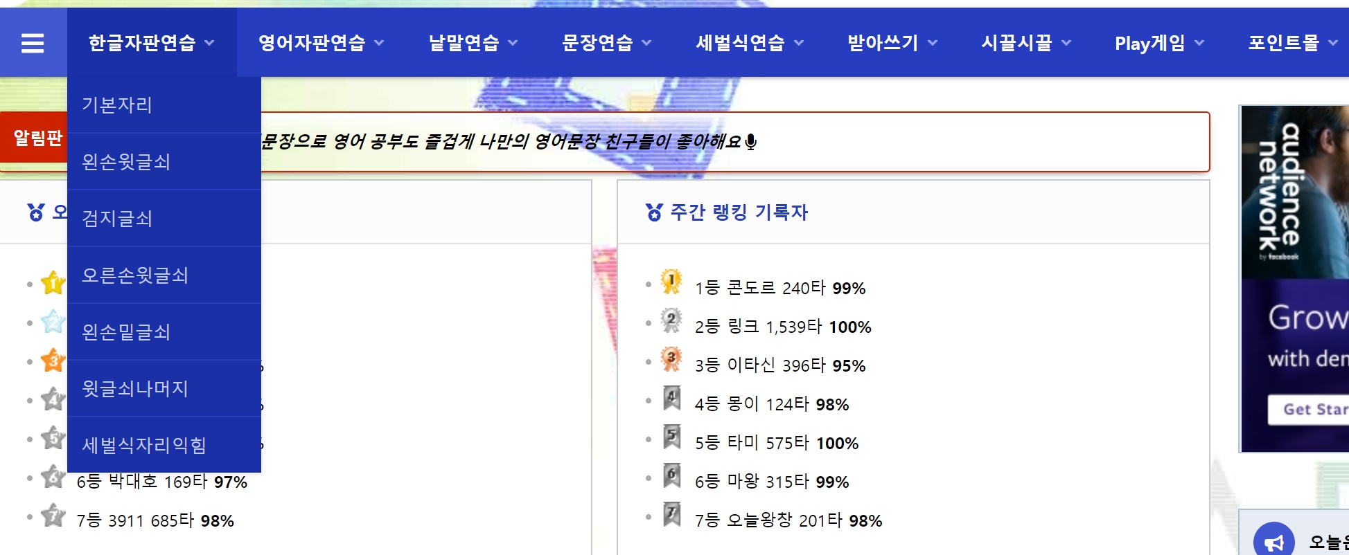 먼저 상단 메뉴에 보면 상당히 많은 메뉴들이 있습니다. 한글은 모두 다 잘 하실테지만 영어타자를 연습 하시는 분들이라면 기본부터 하나씩 연습하는 게 좋겠습니다. 메뉴 제일 앞에 있는 한글자판연습에 보면 기본적인 자판 자리를 연습할 수 있는 메뉴가 있습니다.
