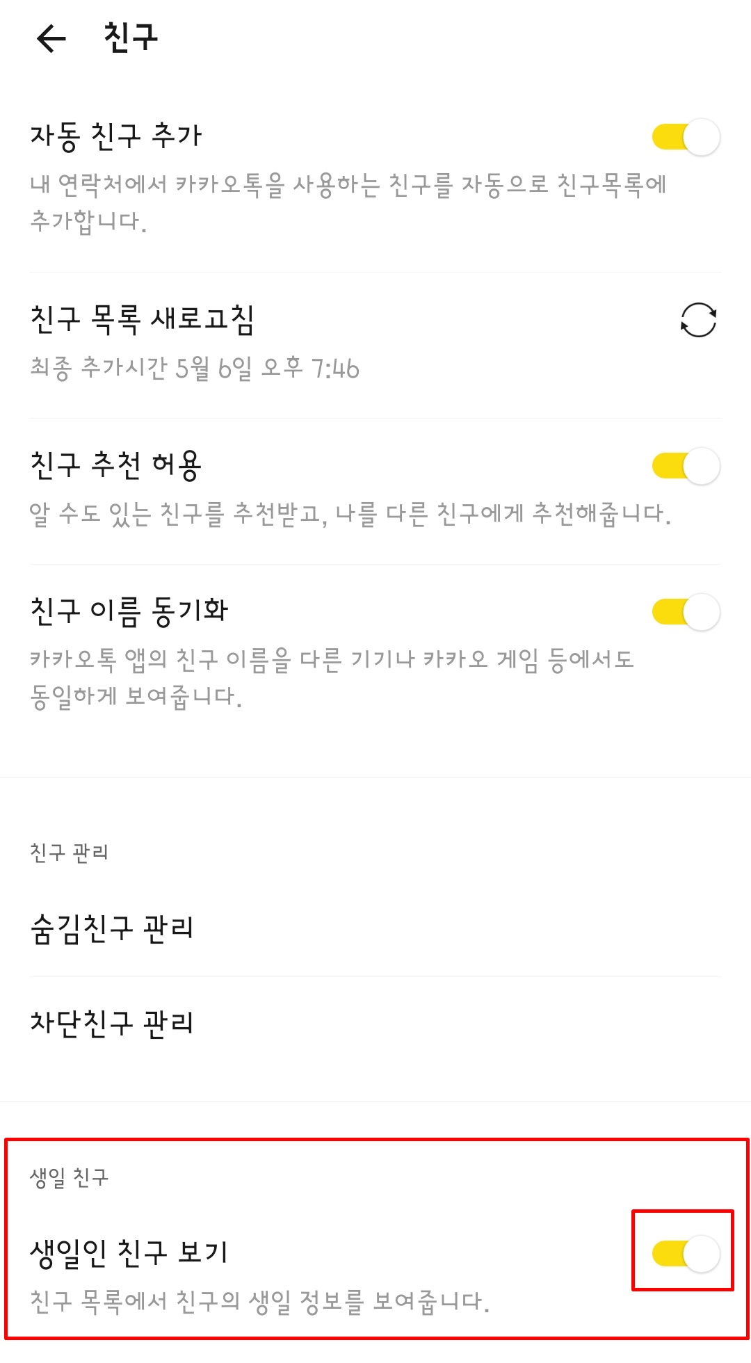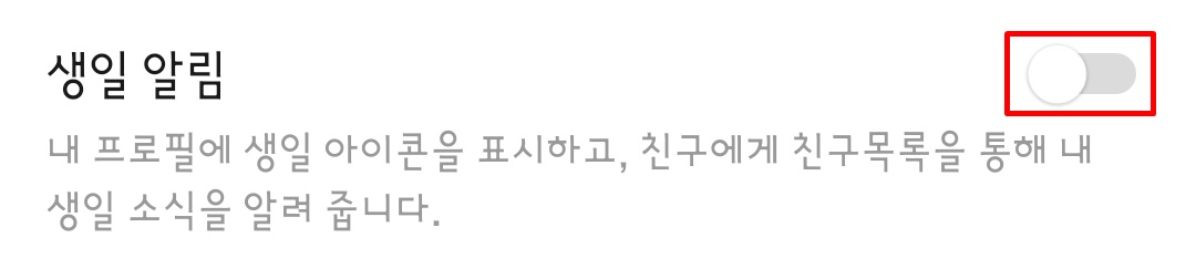 생일 알림 체크를 꺼주시면 되겠습니다. 그럼 다른 친구들에게 내 생일이 공개 되지 않습니다. 카카오톡 생일 비공개하는 방법 아주 간단합니다. 그렇다면 내 메인화면에 친구들의 생일이 나오지 않게 하려면? 이 방법도 상당히 간단합니다.