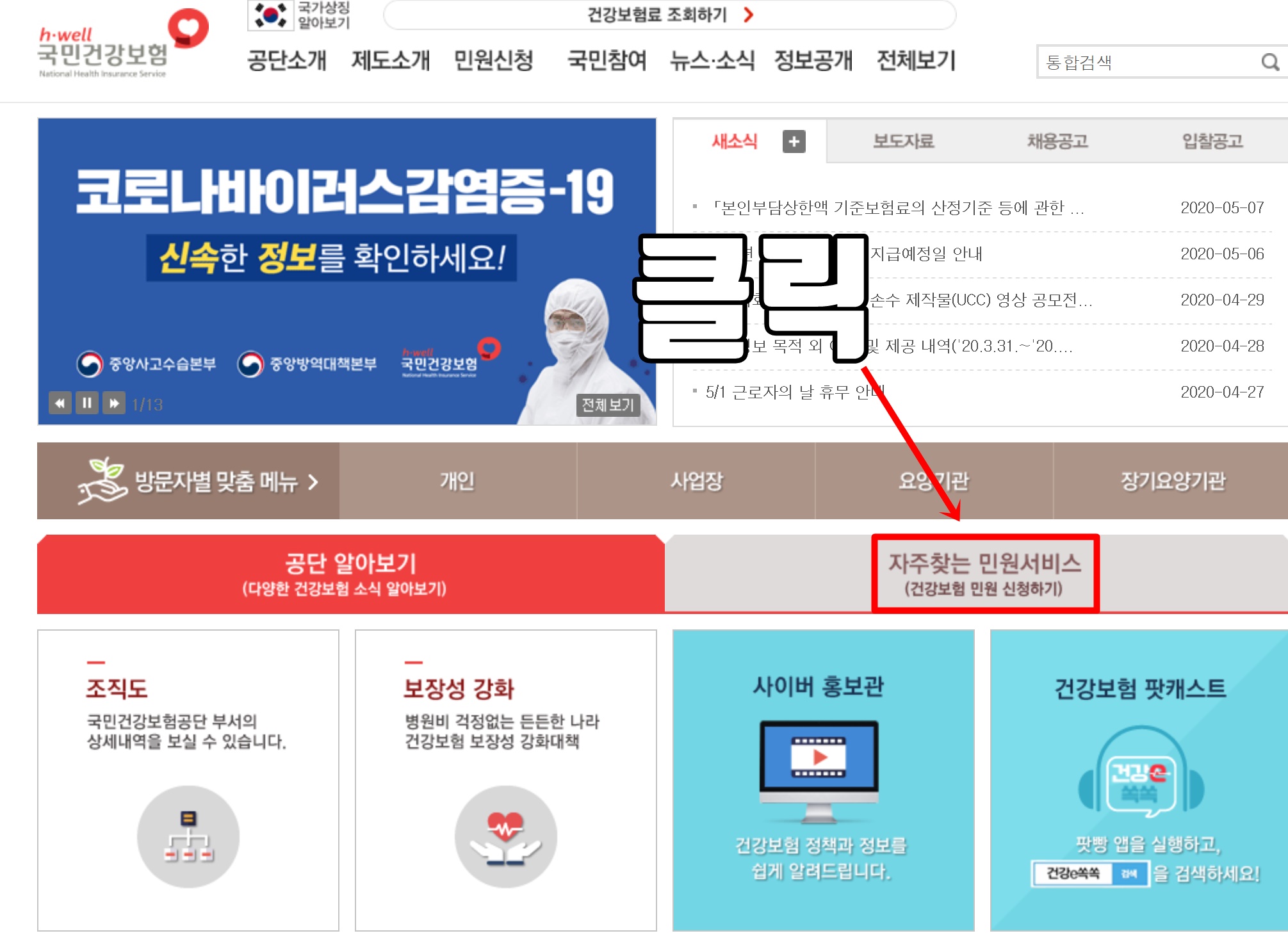 먼저 국민건강보험공단 사이트로 들어가 주시면 되겠습니다.