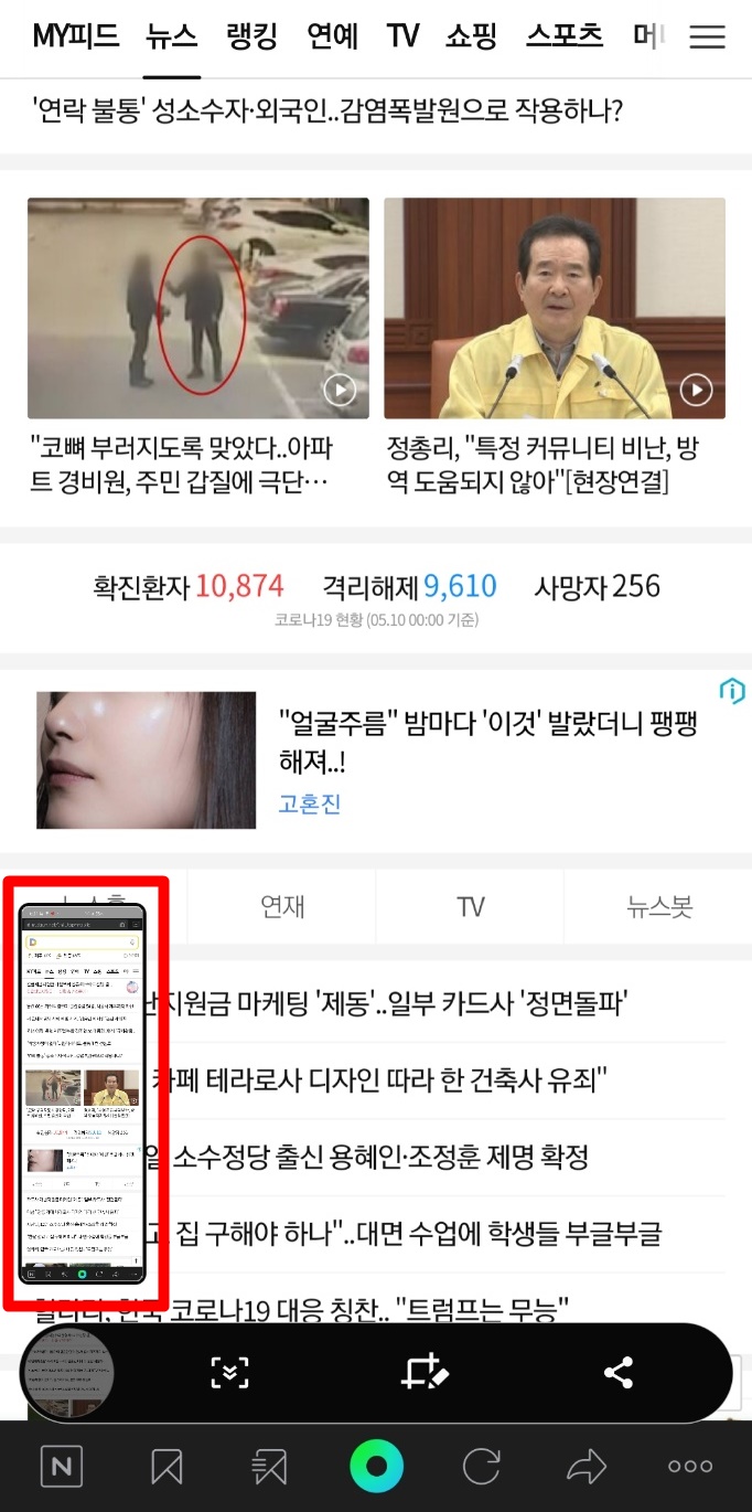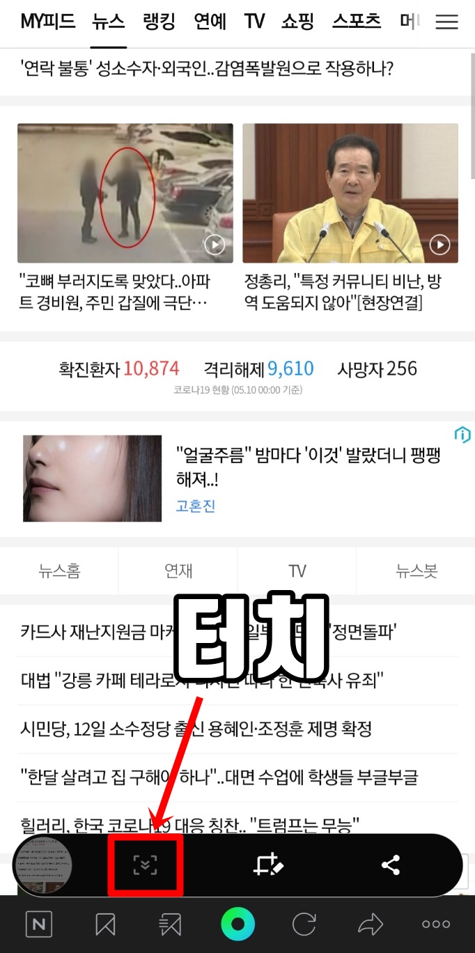 본인이 원하는 화면을 캡쳐하기를 눌러 줍니다. 화면 캡처는 여러 가지 방법이 있지만 전원 버튼과 음량 하 버튼을 동시에 눌러 주시면 쉽게 스크린샷을 찍을 수 있습니다. 화면 캡처 툴바가 설정되어 있지 않다면 위 사진처럼 아래 툴바가 나오지 않습니다. 하지만 화면 캡처 툴바를 설정해야 전체 스크린샷이 가능합니다.