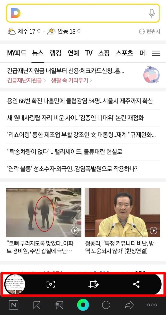 여기서 전체 스크린샷 버튼을 꾹 누르고 있으면 그 화면의 전체가 스크린샷이 찍히게 됩니다. 사실 이 기능은 잘 모르시는 분들이 많이 계실 듯합니다. 왜냐하면 캡처 툴바가 나오면 의외로 불편하다고 느끼는 분들이 계서 설정을 잘해놓지 않기 때문입니다. 하지만 전체 화면 스크린샷을 찍기 위해서는 툴바 설정을 필수이고 사용하기 아주 유용합니다.