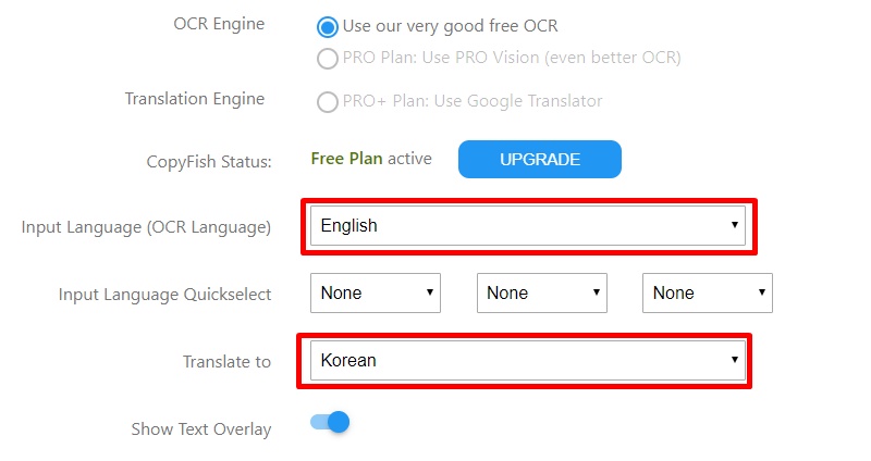 그럼 여러가지 메뉴들이 나오게 되는데 위 이미지를 보시면 빨간 네모칸이 두개가 있습니다. 위에 있는 빨간네모칸이 번역할 글자입니다. 영어를 번역하고 싶으면 영어, 일본어를 번역하고 싶으면 일본어를 선택해주시고 아래 번역될 언어를 선택해주시면 되겠습니다. 예전에는 프로그램을 다운로드해야 했지만 지금은 다운로드 없이 바로 사용이 가능합니다.