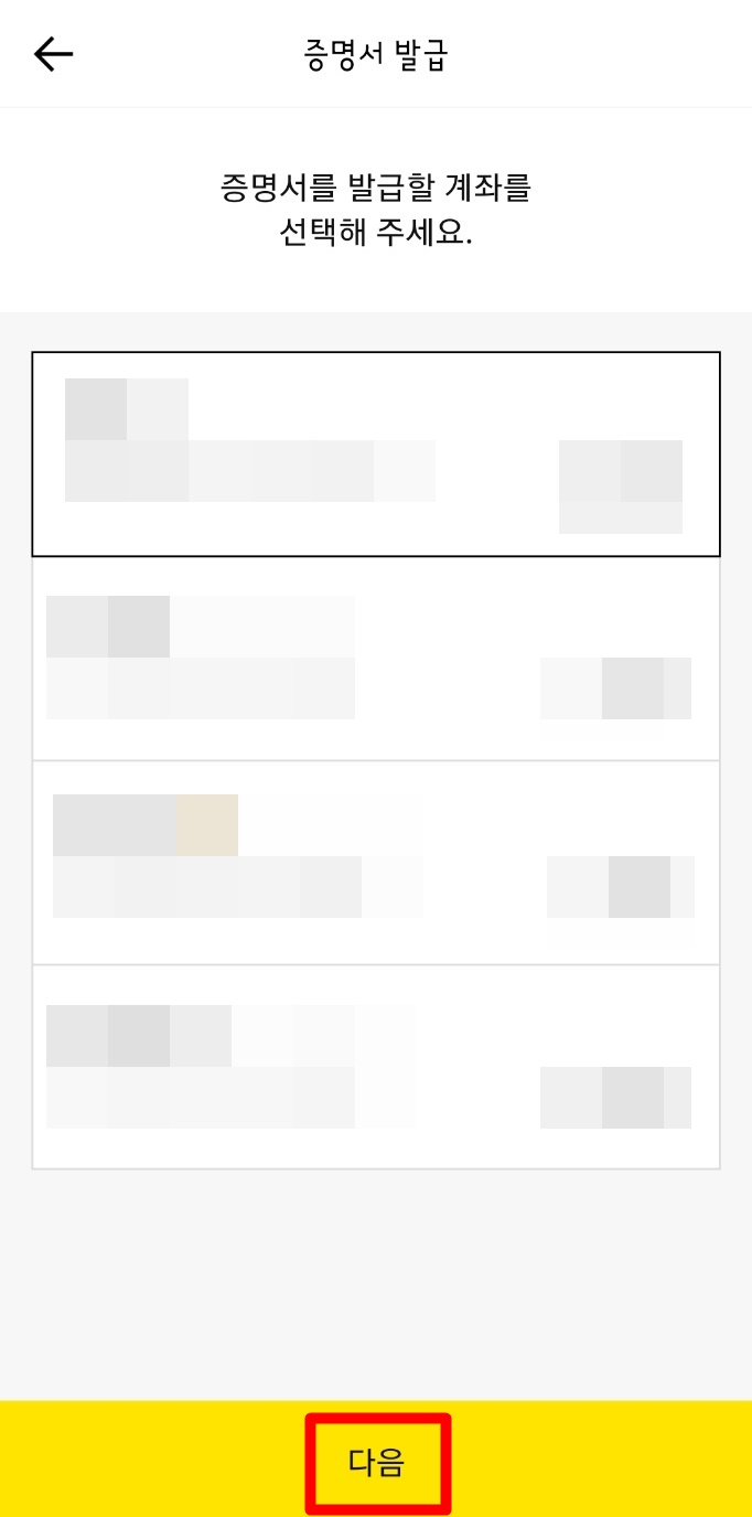 그럼 본인이 보유하고 있는 통장정보가 나오게 되고 본인이 발급받고 싶은 통장을 선택해주시고 다음을 눌러 주시면 됩니다. 신청하기 > 확인 눌러 주시면 본인의 문자로 메시지 하나가 날아옵니다. 바로 홈페이지를 통해 출력을 하라는 안내 문자입니다.