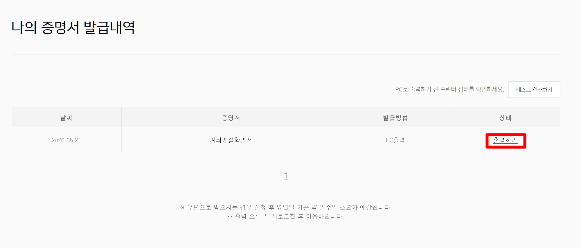 발급방법을 선택해주시면 되겠습니다. 발급 방법은 두가지가 있습니다. PC 출력과, 우편발송이 있는데 우편 발송은 시간이 오래 걸리니 PC 출력으로 선택을 해주시면 됩니다.