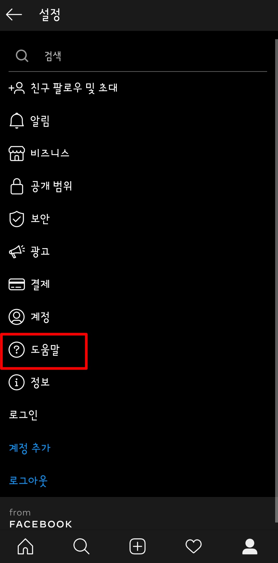 그럼 설정 메뉴가 나타나게 되는데 여기서 도움말을 선택해서 들어가 주시면 고객센터라는 메뉴가 나타납니다. 고객센터를 터치하여 들어 가주시면 됩니다.