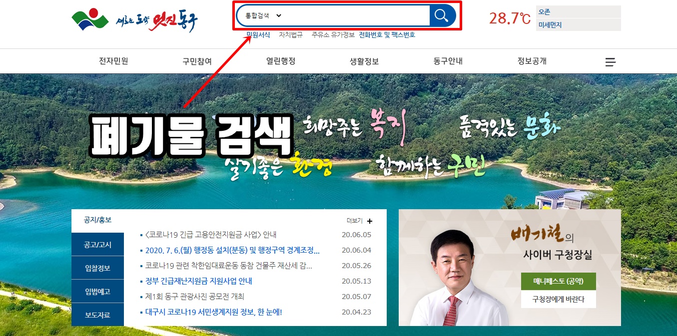 본인 살고 있는 구청홈페이지를 접속해주시면 되겠습니다. 저는 예로 대구 동구로 예를 들어 보겠습니다. 구청 홈페이지로 들어가서 검색 창에 폐기물이라고 검색을 해주시면 되겠습니다.
