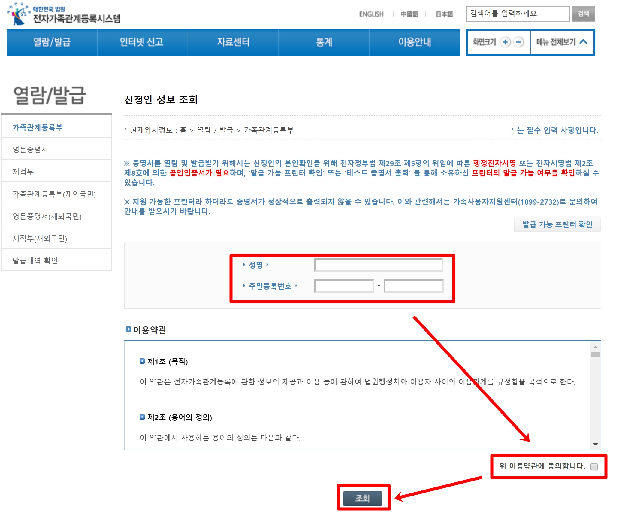 먼저 포털사이트에서 대법원 전자 가족관계 등록시스템을 검색하시면 사이트 하나가 나옵니다. 그럼 그 사이트를 들어 가주시면 됩니다. 먼저 준비물이 있습니다. 아무래도 개인정보를 발급받는 거기 때문에 꼭 공인인증서가 있어야 발행이 가능하고, PDF로 다운로드가 되지 않기 때문에 프린터가 꼭 있어야 발급이 가능합니다. 가족관계증명서 인터넷 발급 전에는 꼭 공인인증서와 프린터를 확인해주세요.