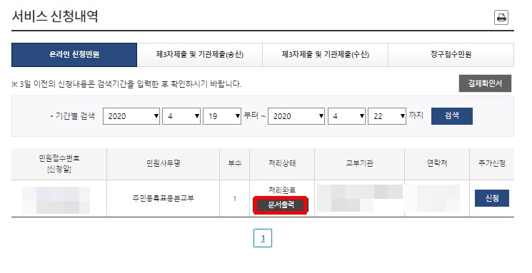그럼 서비스 신청내역창으로 이동을 하게 됩니다. 본인이 신청한 서류를 확인할 수가 있고 문서 출력을 눌러주시면 인 쇄하면으로 넘어가게 됩니다.