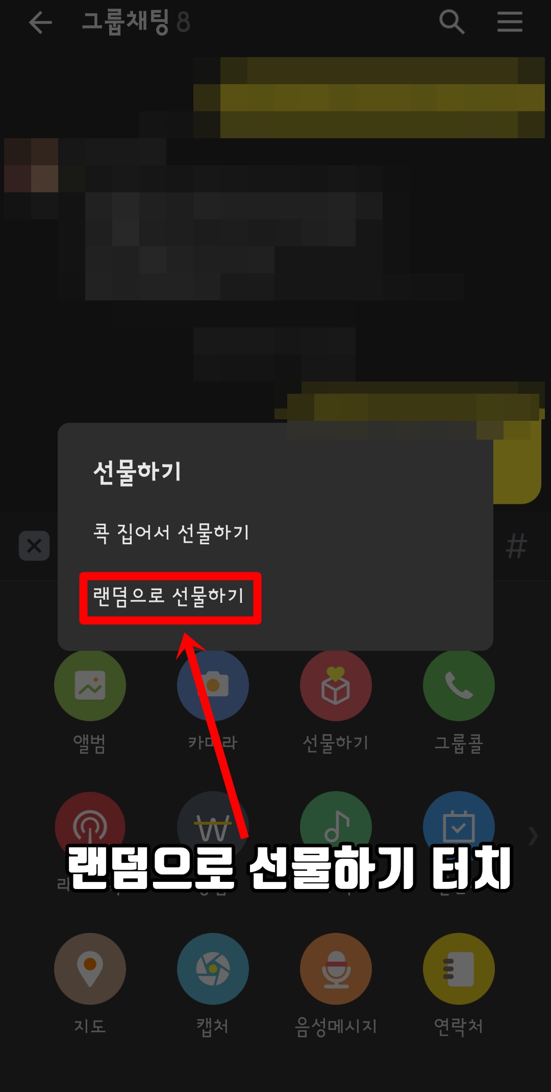 카카오톡 랜덤 선물하기는 단체 채팅방에서만 가능합니다. 본인이 랜던으로 선물하기 할 채팅방을 선택해서 들어 가주시면 되겠습니다.