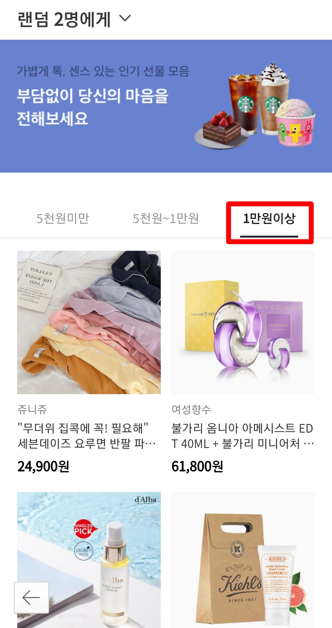 그럼 여러 가지 선물들이 가격대별로 나오게 됩니다. 5천 원 미만, 5천 원~1만 원, 1만 원 이상으로 적당한 금액에서 선물을 할 수 있도록 준비가 되어 있습니다. 저는 5천 원 미만에서 선택을 해보았습니다.