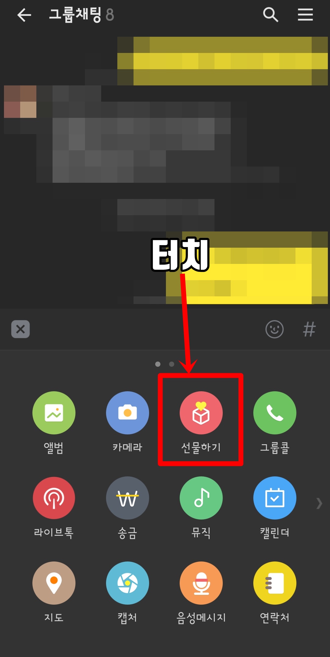 1:1 채팅방에서 선물하기를 눌러 주시면 바로 선물하기 화면으로 이동을 하게 됩니다. 하지만 단체 채팅방에서 선물하기를 터치하시면 두 개의 메뉴가 나오게 됩니다.
