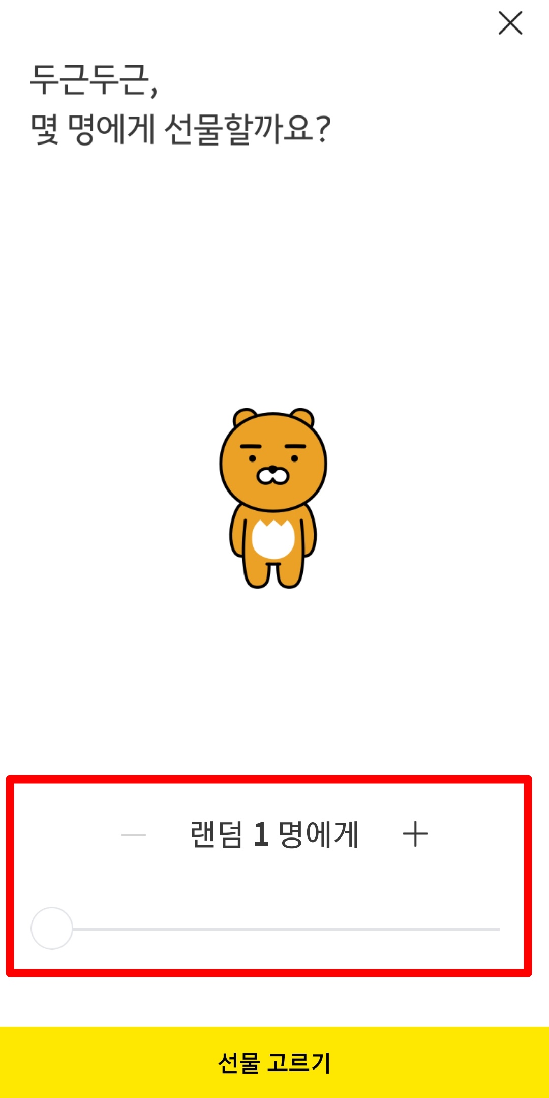 그럼 위와 같은 화면으로 이동하게 됩니다. 여기서 랜덤으로 몇 명에게 선물할 건지 선택을 해주시면 되겠습니다. 인원을 추가하게 되면 캐릭터가 늘어나요. 너무 귀엽습니다. 인원을 선택 후 선물 고르기 터치해주세요.