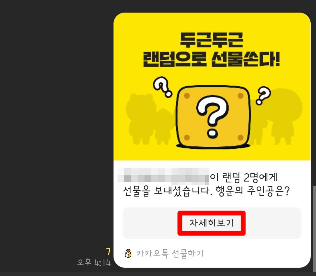 그럼 위와 같은 채팅이 단체 채팅방에 나오게 됩니다. 여기서 자세히 보기를 터치하게 되면 담청이 되었는지 아닌지 확인을 할 수가 있습니다. 아주 재미있는 카카오톡 랜덤으로 선물하기입니다.