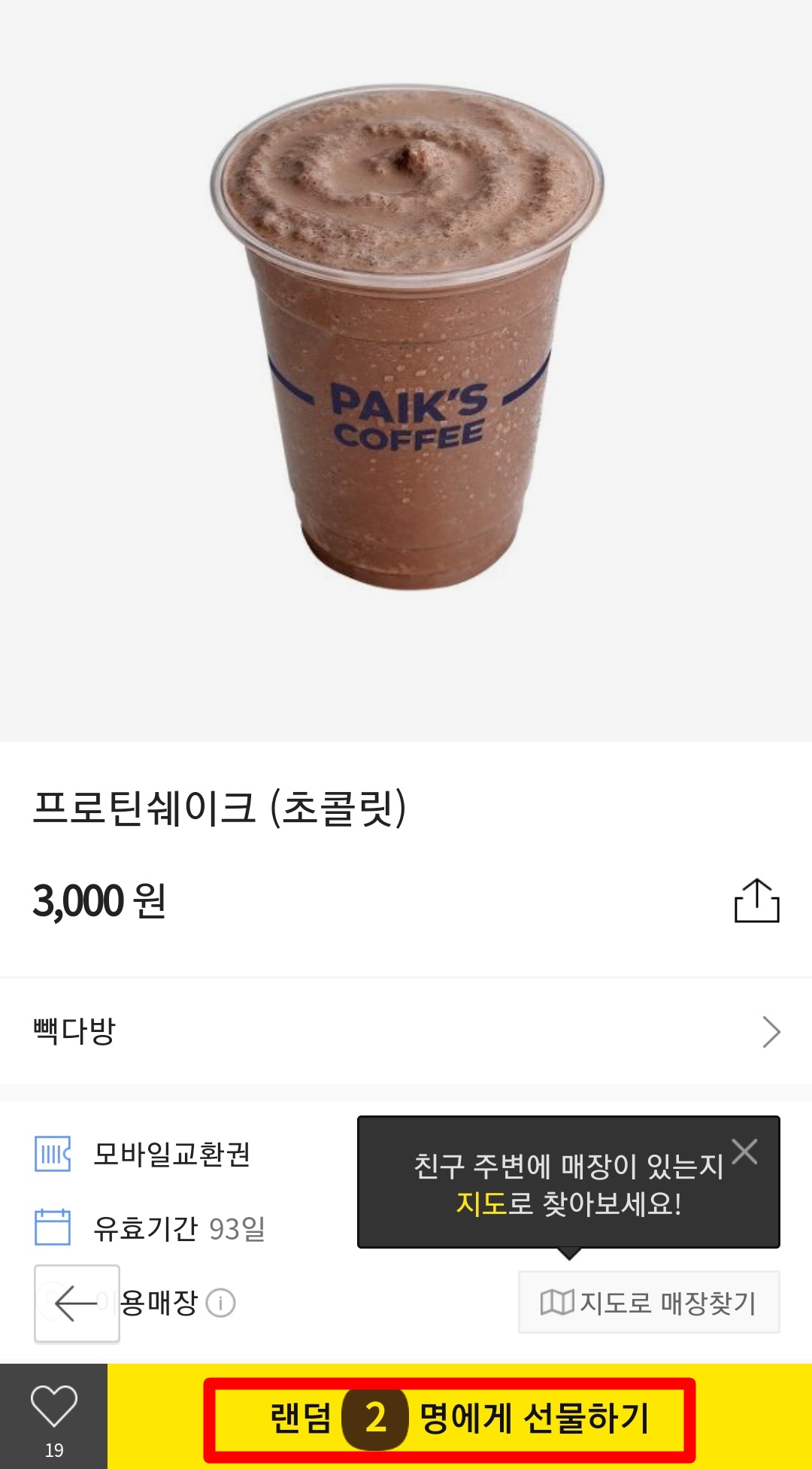 무더운 여름 시원하게 당 충전하라고 빽다방 프로틴쉐이크를 선물하기로 하였습니다. 한잔에 3,000원! 두 명 랜덤으로 선물하기 하여서 6,000원에 구매를 하였습니다. 메시지 카드까지 쓰고 결제하면 끝! 간단하죠?