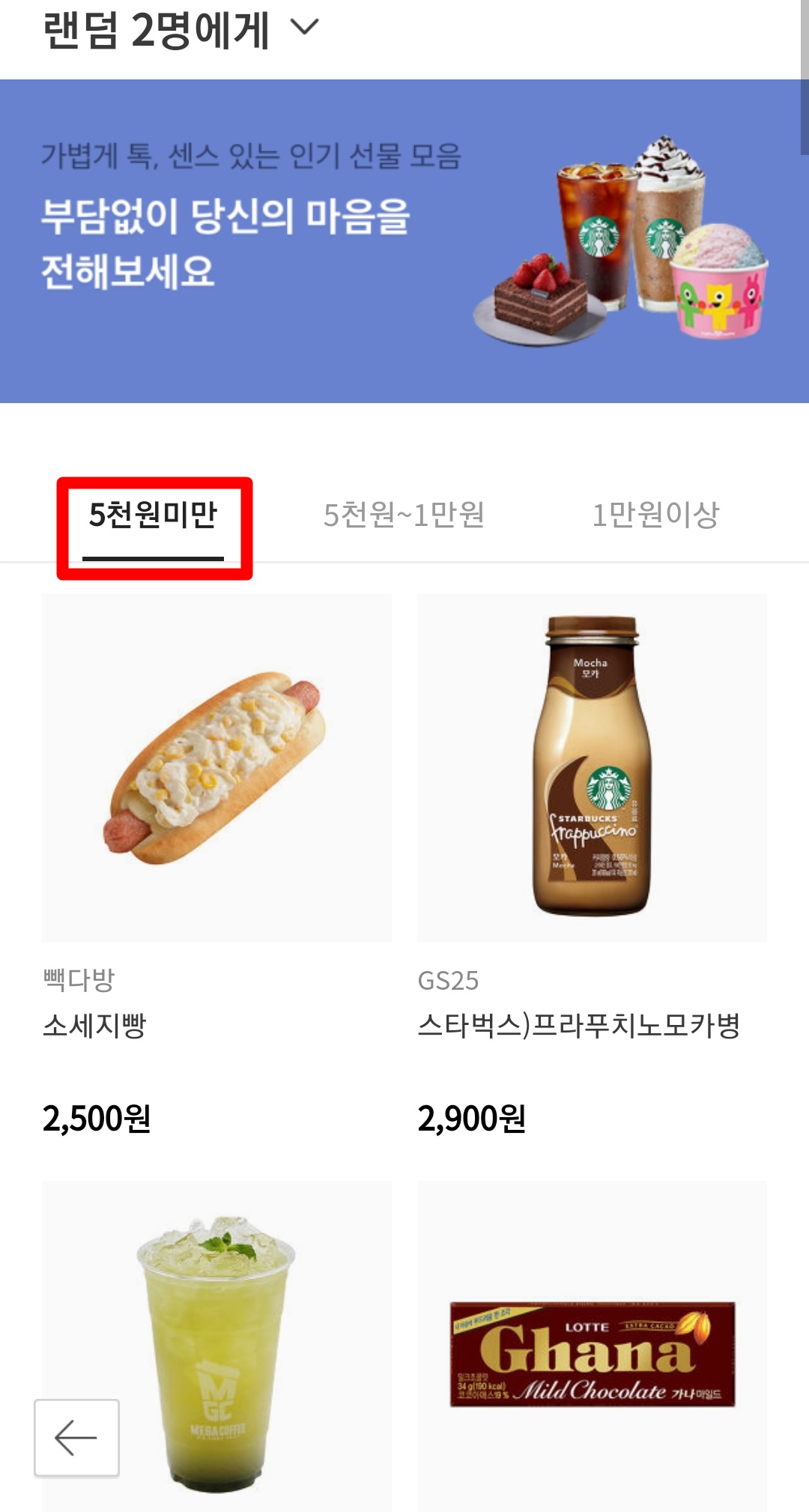 그럼 여러 가지 선물들이 가격대별로 나오게 됩니다. 5천 원 미만, 5천 원~1만 원, 1만 원 이상으로 적당한 금액에서 선물을 할 수 있도록 준비가 되어 있습니다. 저는 5천 원 미만에서 선택을 해보았습니다.
