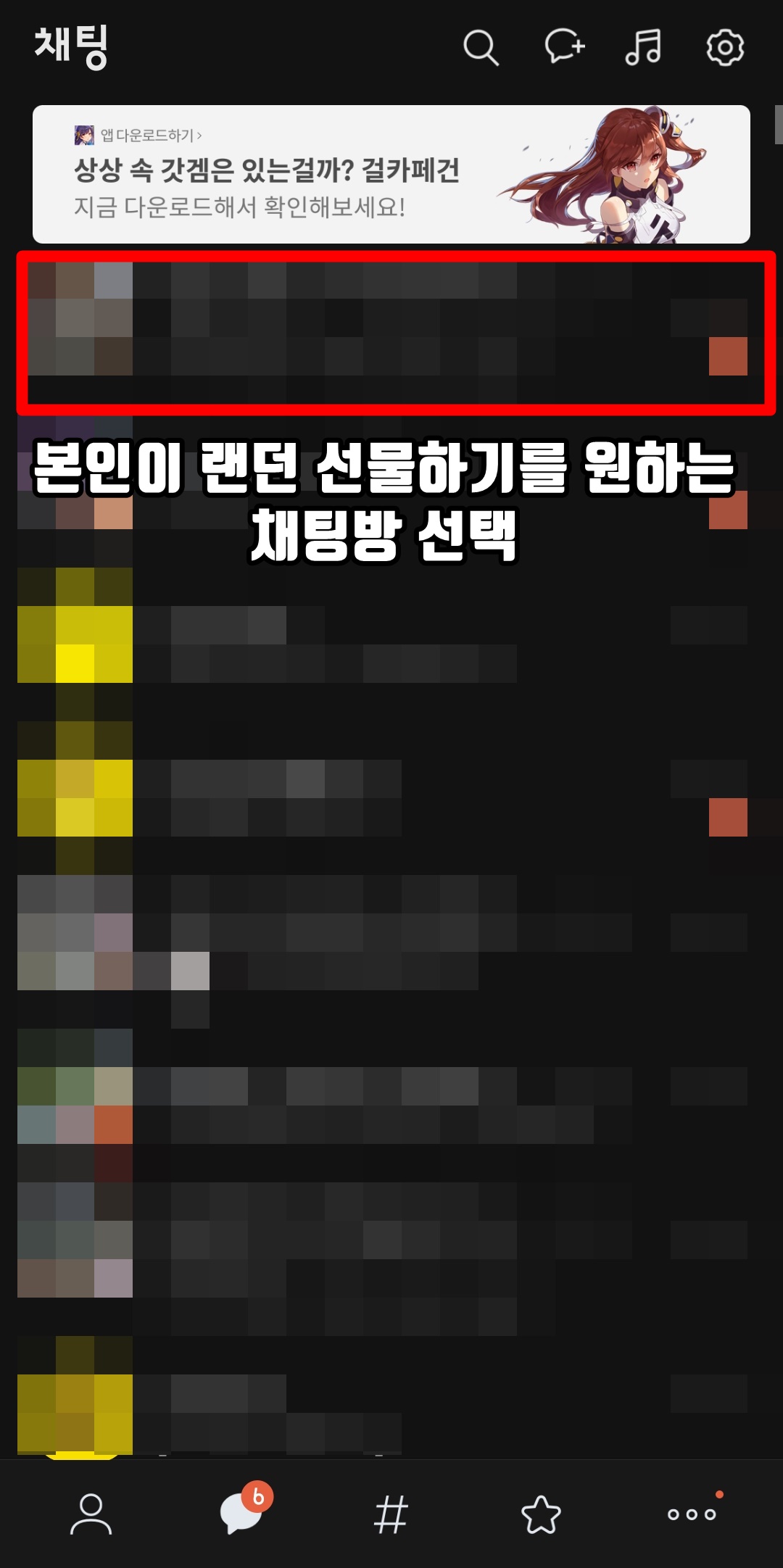 카카오톡 랜덤 선물하기는 단체 채팅방에서만 가능합니다. 본인이 랜던으로 선물하기 할 채팅방을 선택해서 들어 가주시면 되겠습니다.
