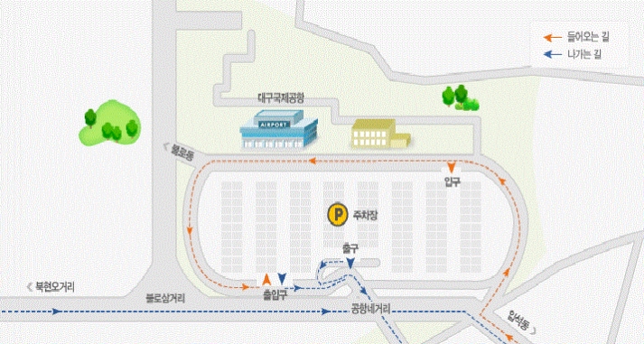 먼저 대구공항 주차장 안내입니다. 위 지도를 확인하시고 대구공항 주차장을 이용해주시면 되겠습니다. 주차장 입구는 통 두 곳이 있으니 잘 확인하여 진입해주시면 되겠습니다.