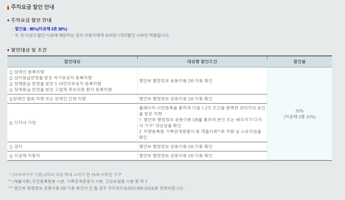 참고로 다자녀가구의 기준은 2자녀 이상 막내 나이가 만 15세 이하인 가구를 말하고 제출 서류로는 주민등록증 사본, 가족관계 증명서 사본, 건강보험증 사본 중 하나를 제출해주셔야 합니다. 그리고 행안부 행정정보 공동이용 DB 자동 확인이 안 될 경우 주차관리실 053-980-5254로 연락 주시면 됩니다.