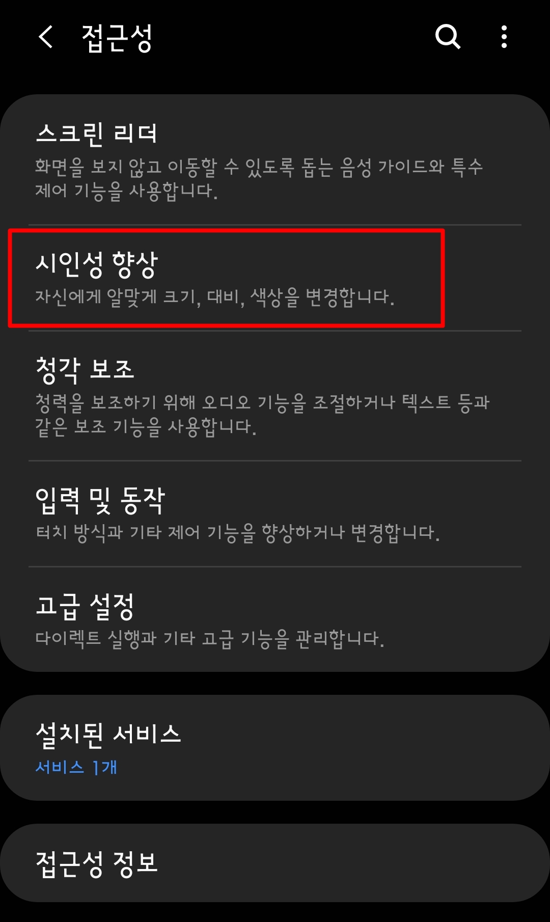 접근성으로 진입하게 되면 스크린 리더, 시인성 향상, 청각보조, 입력 및 동장, 고급 설정 등 다양한 메뉴들이 있습니다. 그중 시인성 향상을 터치해주시면 되겠습니다.