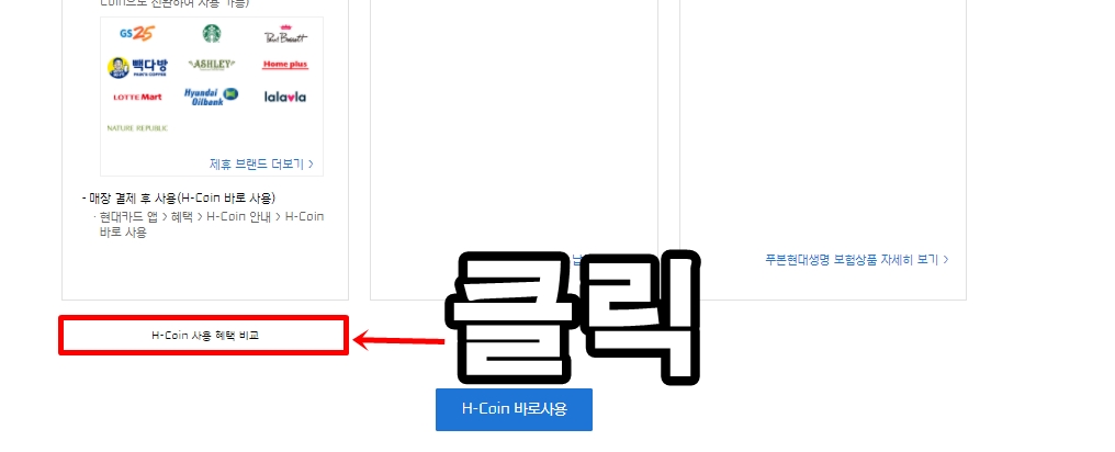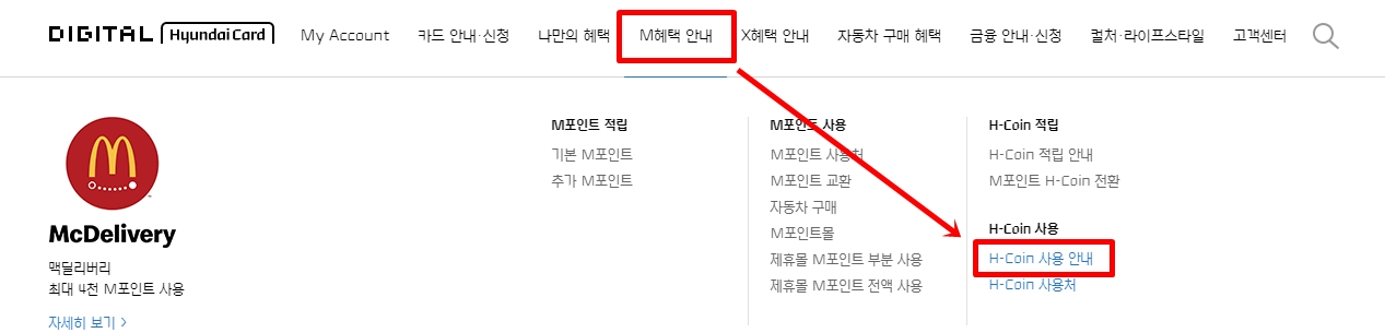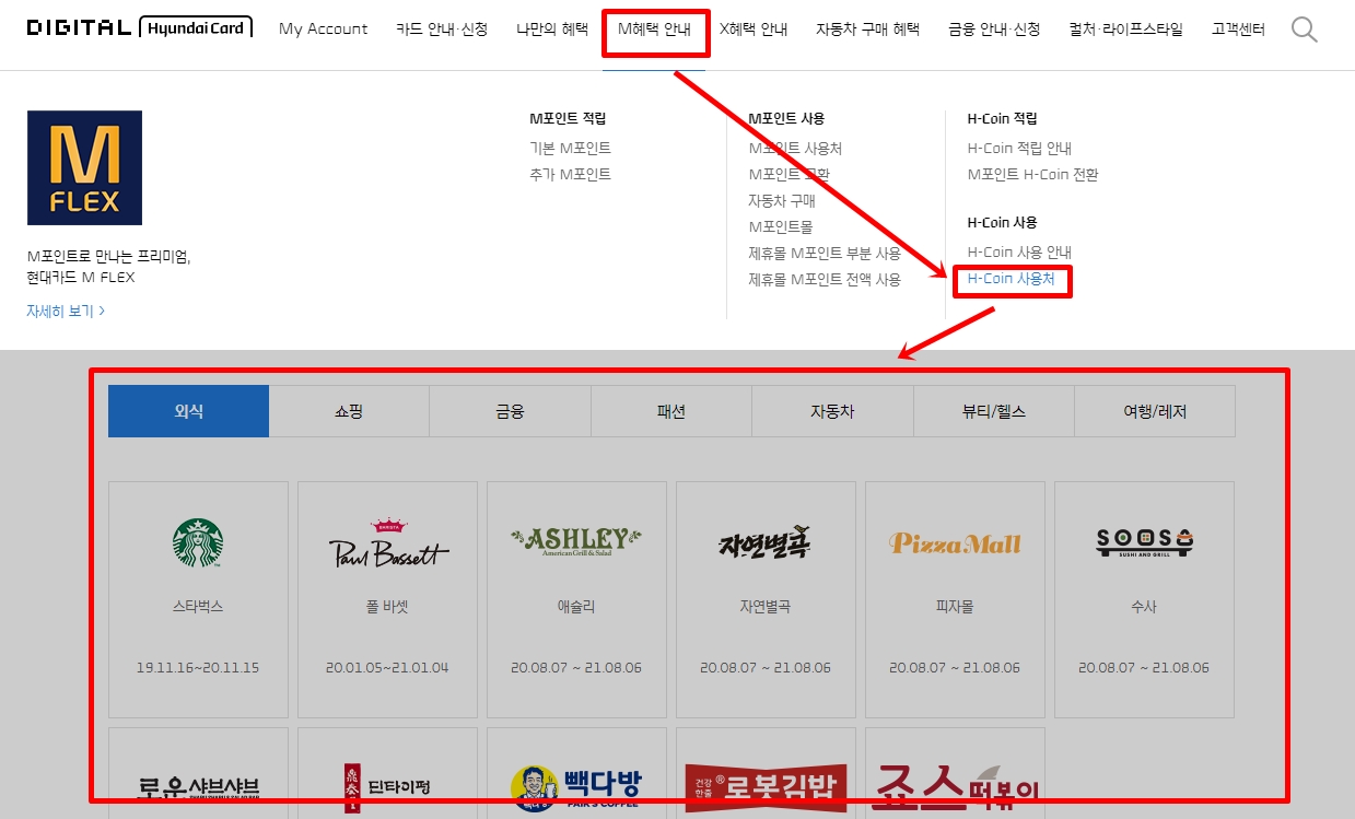 홈페이지 상단 메뉴에서 M혜택 안내 > H-coin 사용처로 들어 가주시면 됩니다.