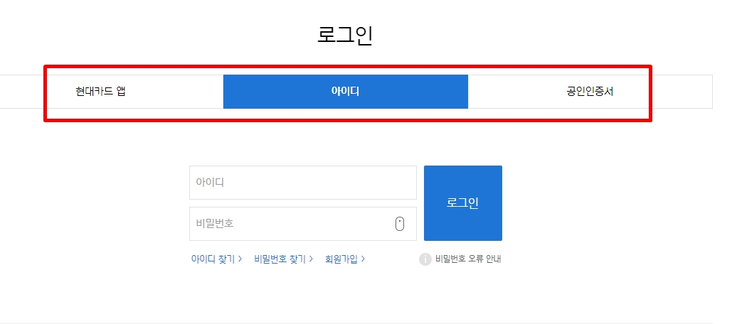 로그인 방법은 세 가지가 있습니다. 현대카드 앱을 통해 QR코드나 번호로 로그인 방법, 아이디 로그인 방법, 공인인증서 로그인 방법 본인이 편한 방법으로 로그인해주시면 됩니다.