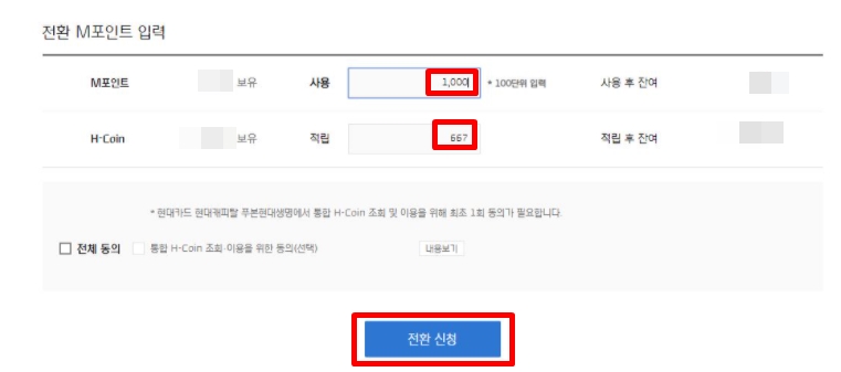 예로 M포인트 1000점을 현금화해보도록 하겠습니다. 그럼 위와 같이 H코인은 1000원이 아닌 667원으로 적립되는 것을 보실 수가 있을 겁니다.