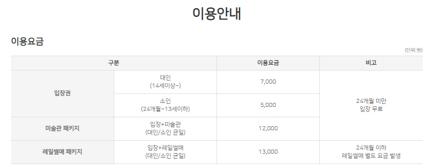 입장권 대인(14세 이상~) : 7,000원 / 소인(24개월~13세 이하) : 5,000원 / 24개월 미만 입장 무료