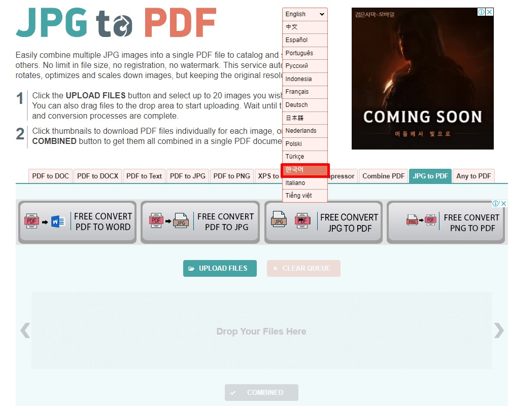 사이트에 접속을 하면 메인화면이 보이십니다. 그런데 보기만 해도 답답한 영어입니다. 그렇지만 걱정 마십시요. 한글로 변경이 가능합니다. 상단에 JPGtoPDF옆에 보면 언어 설정할 수 있는 메뉴가 있습니다. 클릭 안 하셔도 되고 마우스 커서 가져다 놓으면 언어들이 쭉 보이게 됩니다.